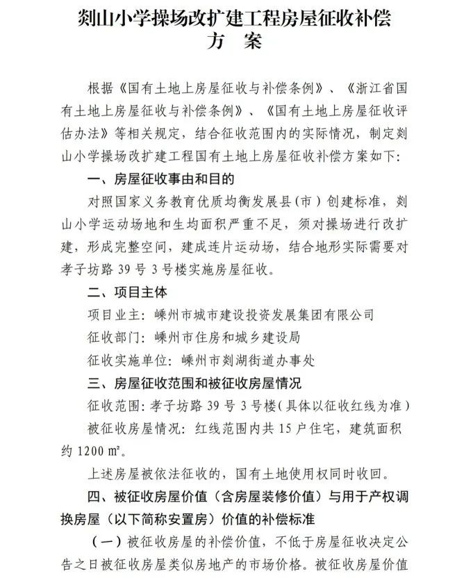 因剡山小學操場改擴建需要,根據《國有土地上房屋征收與補償條例》《浙江省國有土地上房屋征收與補償條例》有關規(guī)定,嵊州市人民政府制定《剡山小學操場改擴建工程房屋征收補償方案》,并依法作出《關于對剡山小學操場改擴建工程所涉房屋實施征收的決定》,現(xiàn)予以公告。