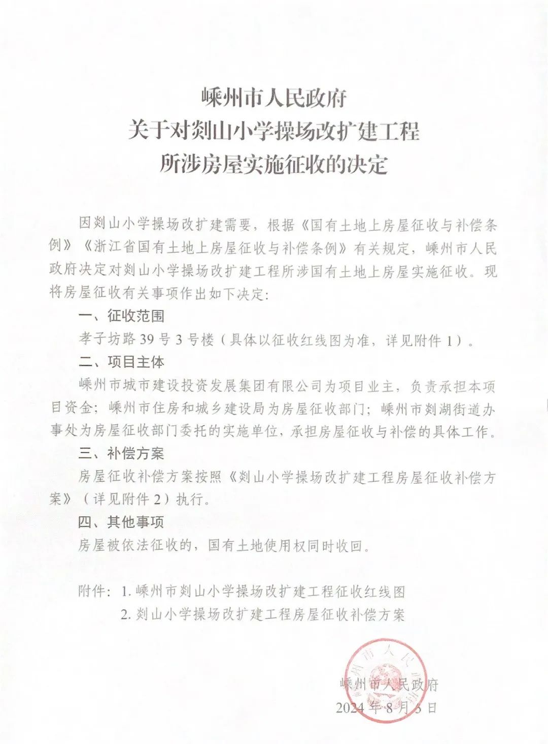 附件: 關于對剡山小學操場改擴建工程所涉房屋實施征收的決定