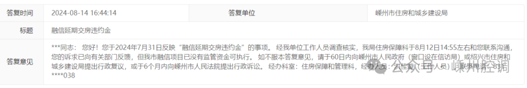**同志:您好!您于2024年7月31日反映“融信延期交房違約金”的事項。經(jīng)我單位工作人員調(diào)查核實,我局住房保障科于8月12日14:55左右和您聯(lián)系溝通,您的訴求已向有關部門反饋,但我市融信項目已沒有監(jiān)管資金可執(zhí)行。如不服本答復意見,請于60日內(nèi)向嵊州市人民政府(窗口設在信訪局)或紹興市住房和城鄉(xiāng)建設局提出行政復議,或于6個月內(nèi)向嵊州市人民法院提出行政訴訟。經(jīng)辦科室:住房保障和管理科,經(jīng)辦人員:洪佳璇(工作人員),聯(lián)系電話:831***038