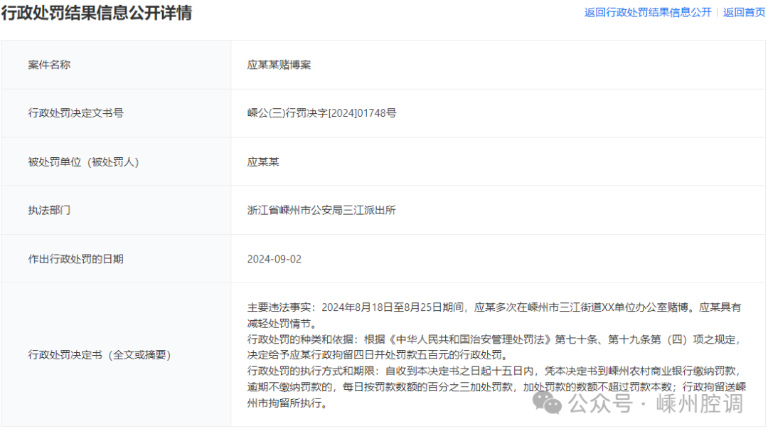 主要違法事實(shí):2024年8月18日至8月25日期間,應(yīng)某某多次在嵊州市三江街道XX單位辦公室賭博。應(yīng)某某具有減輕處罰情節(jié)。
