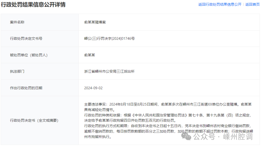 主要違法事實(shí):2024年8月18日至8月25日期間,俞某某多次在嵊州市三江街道XX單位辦公室賭博。俞某某具有減輕處罰情節(jié)。