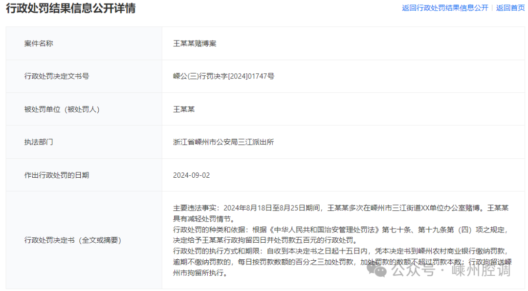 主要違法事實(shí):2024年8月18日至8月25日期間,王某某多次在嵊州市三江街道XX單位辦公室賭博。王某某具有減輕處罰情節(jié)。