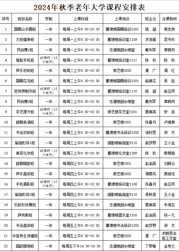 目前開設專業(yè)有:越劇表演、圍棋、聲樂、瑜伽、民族舞、旗袍秀、太極拳、薩克斯、手機攝影、茶藝、書法、國畫、中醫(yī)養(yǎng)生保健等20多個專業(yè)。