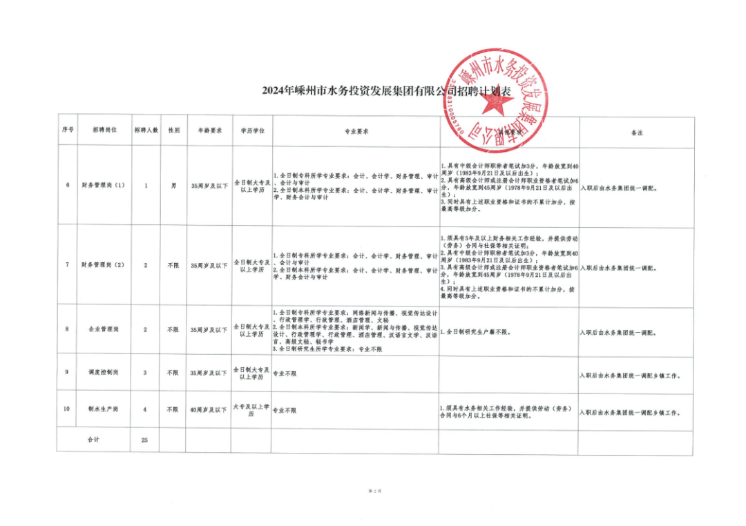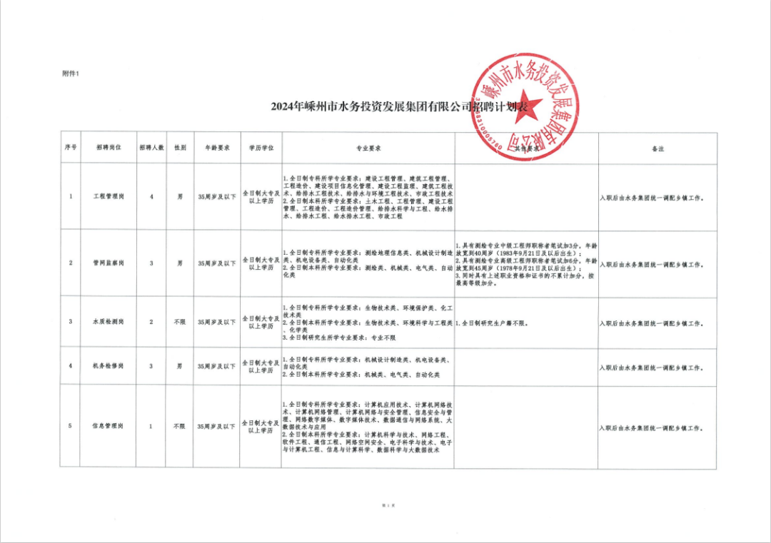 附件1:2024年嵊州市水務(wù)投資發(fā)展集團有限公司招聘計劃表