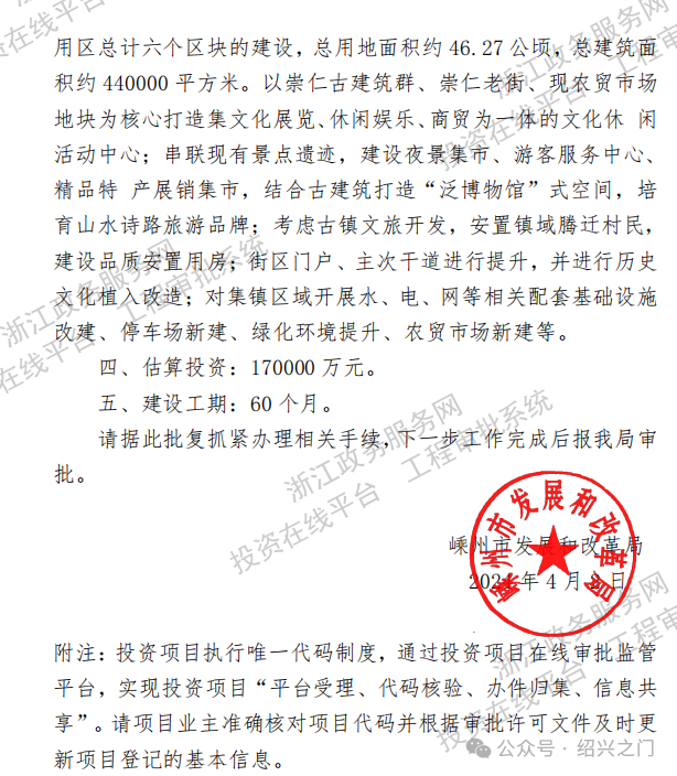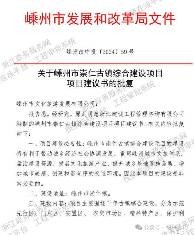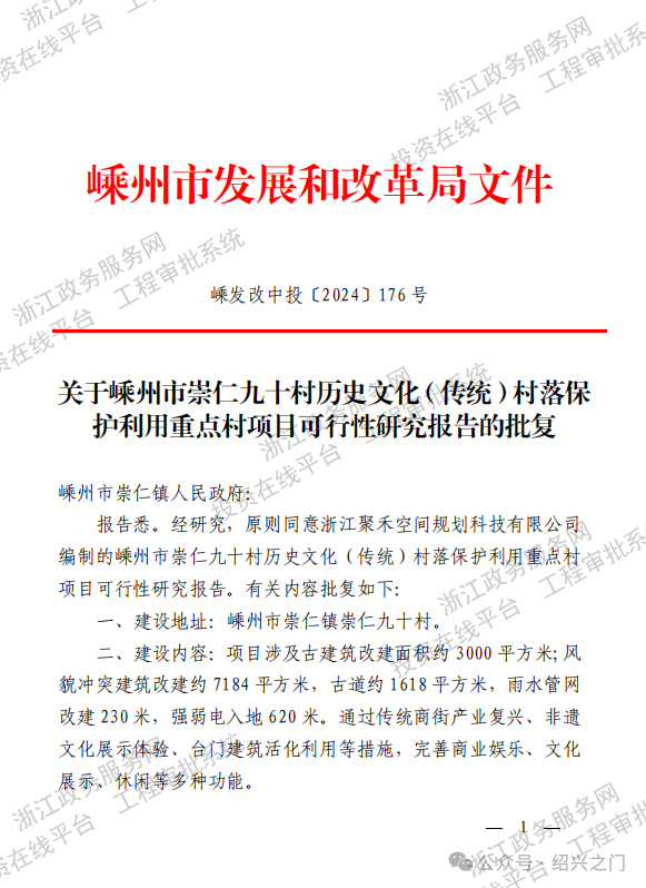 剛剛,關(guān)于嵊州市崇仁九十村歷史文化(傳統(tǒng))村落保護(hù)利用重點村項目可行性研究報告的批復(fù)發(fā)布。