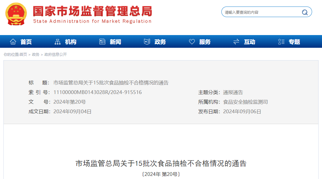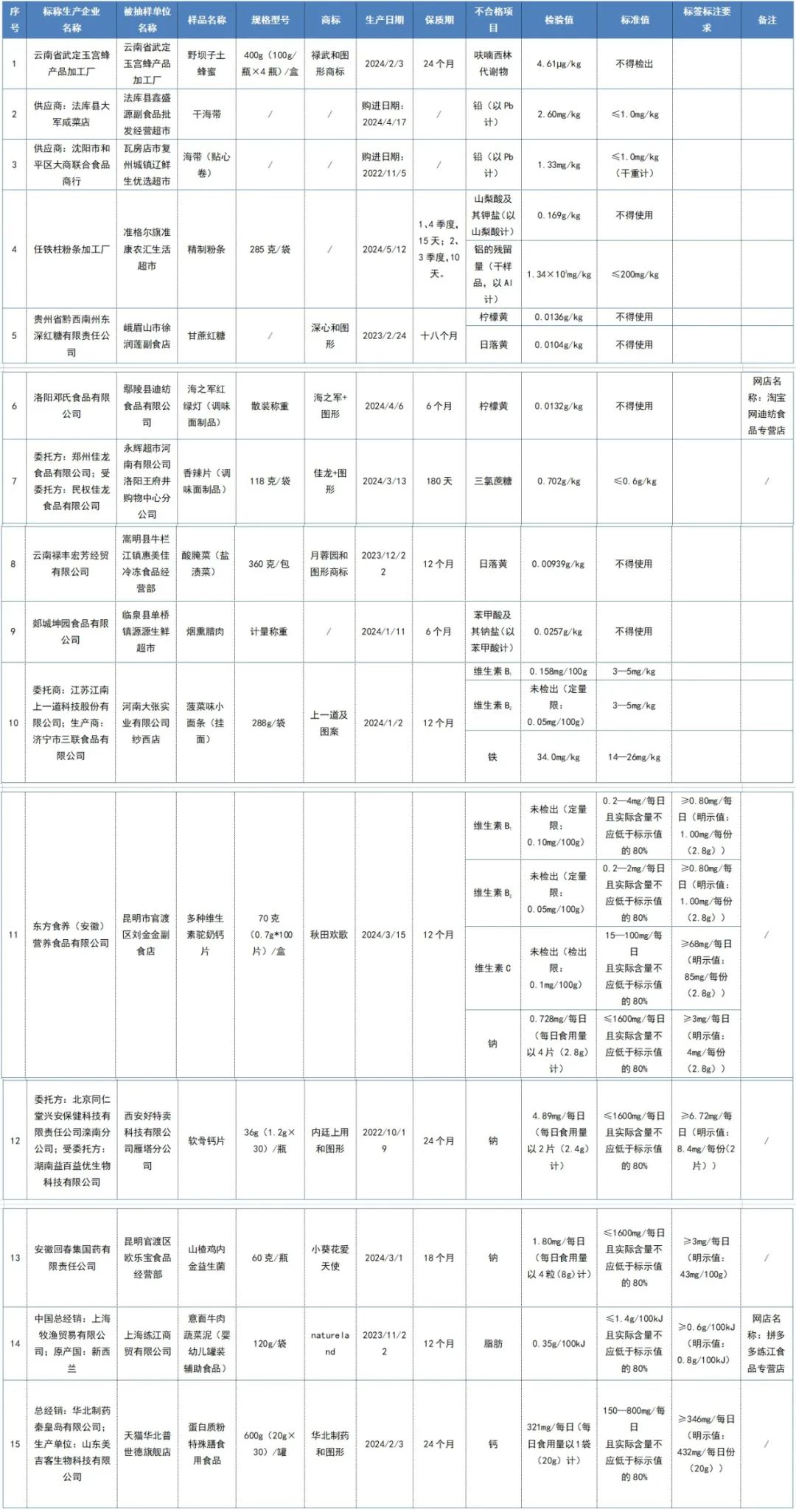 市場(chǎng)監(jiān)管總局發(fā)布通告標(biāo)稱云南省武定玉宮蜂產(chǎn)品加工廠生產(chǎn)的“祿武”野壩子土蜂蜜,其中呋喃西林代謝物殘留量不符合食品安全國(guó)家標(biāo)準(zhǔn)規(guī)定。遼寧省沈陽(yáng)市法庫(kù)縣鑫盛源副食品批發(fā)經(jīng)營(yíng)超市銷售的、來自遼寧省沈陽(yáng)市法庫(kù)縣大軍咸菜店的干海帶,其中鉛(以Pb計(jì))檢驗(yàn)值不符合食品安全國(guó)家標(biāo)準(zhǔn)規(guī)定。遼寧省大連市瓦房店市復(fù)州城鎮(zhèn)遼鮮生優(yōu)選超市銷售的、來自遼寧省沈陽(yáng)市和平區(qū)大商聯(lián)合食品商行的海帶(貼心卷),其中鉛(以Pb計(jì))檢驗(yàn)值不符合食品安全國(guó)家標(biāo)準(zhǔn)規(guī)定。內(nèi)蒙古自治區(qū)鄂爾多斯市準(zhǔn)格爾旗準(zhǔn)康農(nóng)匯生活超市銷售的、標(biāo)稱內(nèi)蒙古自治區(qū)鄂爾多斯市任鐵柱粉條加工廠生產(chǎn)的精制粉條,其中山梨酸及其鉀鹽(以山梨酸計(jì))檢驗(yàn)值、鋁的殘留量(干樣品,以Al計(jì))不符合食品安全國(guó)家標(biāo)準(zhǔn)規(guī)定。四川省樂山市峨眉山市徐潤(rùn)蓮副食店銷售的、標(biāo)稱貴州省黔西南州東深紅糖有限責(zé)任公司生產(chǎn)的“深心”甘蔗紅糖,其中檸檬黃、日落黃檢驗(yàn)值不符合食品安全國(guó)家標(biāo)準(zhǔn)規(guī)定。淘寶網(wǎng)迪紡食品專營(yíng)店(經(jīng)營(yíng)者為河南省許昌市鄢陵縣迪紡食品有限公司)銷售的、標(biāo)稱河南省洛陽(yáng)鄧氏食品有限公司生產(chǎn)的“海之軍”紅綠燈(調(diào)味面制品),其中檸檬黃檢驗(yàn)值不符合食品安全國(guó)家標(biāo)準(zhǔn)規(guī)定。云南省昆明市嵩明縣牛欄江鎮(zhèn)惠美佳冷凍食品經(jīng)營(yíng)部銷售的、標(biāo)稱云南祿豐宏芳經(jīng)貿(mào)有限公司生產(chǎn)的“月蓉園”酸腌菜(鹽漬菜),其中日落黃檢驗(yàn)值不符合食品安全國(guó)家標(biāo)準(zhǔn)規(guī)定。安徽省阜陽(yáng)市臨泉縣單橋鎮(zhèn)源源生鮮超市銷售的、標(biāo)稱山東省臨沂市郯城坤園食品有限公司生產(chǎn)的煙熏臘肉,其中苯甲酸及其鈉鹽(以苯甲酸計(jì))檢驗(yàn)值不符合食品安全國(guó)家標(biāo)準(zhǔn)規(guī)定。永輝超市河南有限公司洛陽(yáng)王府井購(gòu)物中心分公司銷售的、標(biāo)稱河南省鄭州佳龍食品有限公司委托河南省商丘市民權(quán)佳龍食品有限公司生產(chǎn)的“佳龍”香辣片(調(diào)味面制品),其中三氯蔗糖檢驗(yàn)值不符合食品安全國(guó)家標(biāo)準(zhǔn)規(guī)定。質(zhì)量指標(biāo)不達(dá)標(biāo)河南大張實(shí)業(yè)有限公司紗西店銷售的、標(biāo)稱江蘇江南上一道科技股份有限公司委托山東省濟(jì)寧市三聯(lián)食品有限公司生產(chǎn)的“上一道”菠菜味小面條(掛面),其中維生素B1、維生素B2、鐵含量不符合相關(guān)產(chǎn)品執(zhí)行標(biāo)準(zhǔn)要求。云南省昆明市官渡區(qū)劉金金副食店銷售的、標(biāo)稱東方食養(yǎng)(安徽)營(yíng)養(yǎng)食品有限公司生產(chǎn)的“秋田歡歌”多種維生素駝奶鈣片,其中維生素B1、維生素B2、維生素C含量既不符合食品安全國(guó)家標(biāo)準(zhǔn)規(guī)定,也不符合產(chǎn)品標(biāo)簽標(biāo)示要求;鈉含量符合食品安全國(guó)家標(biāo)準(zhǔn)規(guī)定,但不符合產(chǎn)品標(biāo)簽標(biāo)示要求。質(zhì)量指標(biāo)與標(biāo)簽標(biāo)示值不符陜西省西安好特賣科技有限公司雁塔分公司銷售的、標(biāo)稱河北省唐山市北京同仁堂興安保健科技有限責(zé)任公司灤南分公司委托湖南益百益優(yōu)生物科技有限公司生產(chǎn)的“內(nèi)廷上用”軟骨鈣片,其中鈉含量符合食品安全國(guó)家標(biāo)準(zhǔn)規(guī)定,但不符合產(chǎn)品標(biāo)簽標(biāo)示要求。云南省昆明官渡區(qū)歐樂寶食品經(jīng)營(yíng)部銷售的、標(biāo)稱安徽回春集國(guó)藥有限責(zé)任公司生產(chǎn)的“小葵花愛天使”山楂雞內(nèi)金益生菌,其中鈉含量符合食品安全國(guó)家標(biāo)準(zhǔn)規(guī)定,但不符合產(chǎn)品標(biāo)簽標(biāo)示要求。拼多多練江食品專營(yíng)店(經(jīng)營(yíng)者為上海練江商貿(mào)有限公司)銷售的、標(biāo)稱上海牧漁貿(mào)易有限公司經(jīng)銷的“natureland”意面牛肉蔬菜泥(嬰幼兒罐裝輔助食品),其中脂肪含量符合食品安全國(guó)家標(biāo)準(zhǔn)規(guī)定,但不符合產(chǎn)品標(biāo)簽標(biāo)示要求。天貓華北普世德旗艦店(經(jīng)營(yíng)者為河北華昱健康大藥房連鎖有限公司)銷售的、標(biāo)稱河北省華北制藥秦皇島有限公司經(jīng)銷的、山東美吉客生物科技有限公司生產(chǎn)的“華北制藥”蛋白質(zhì)粉特殊膳食用食品,其中鈣含量符合食品安全國(guó)家標(biāo)準(zhǔn)規(guī)定,但不符合產(chǎn)品標(biāo)簽標(biāo)示要求。