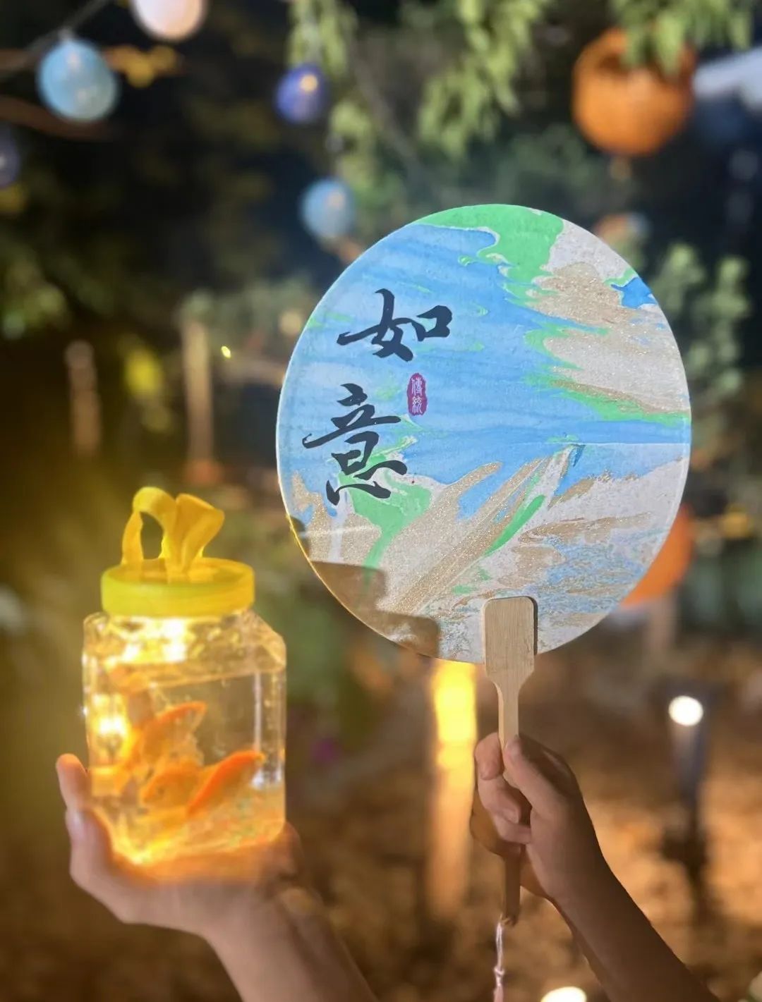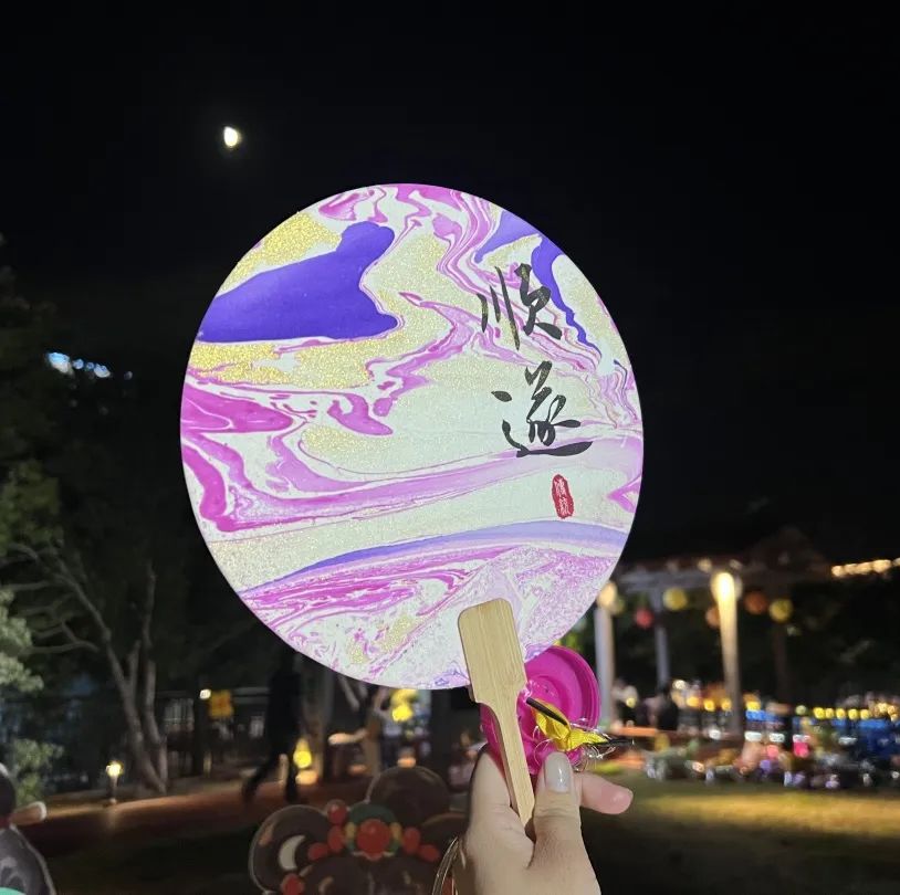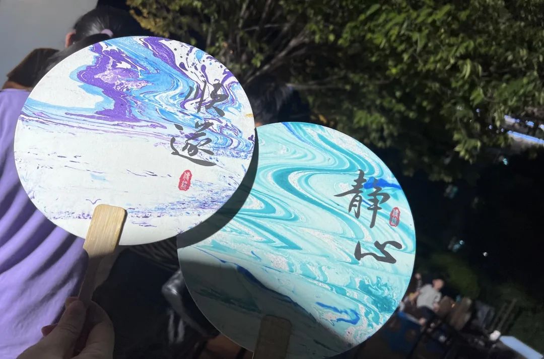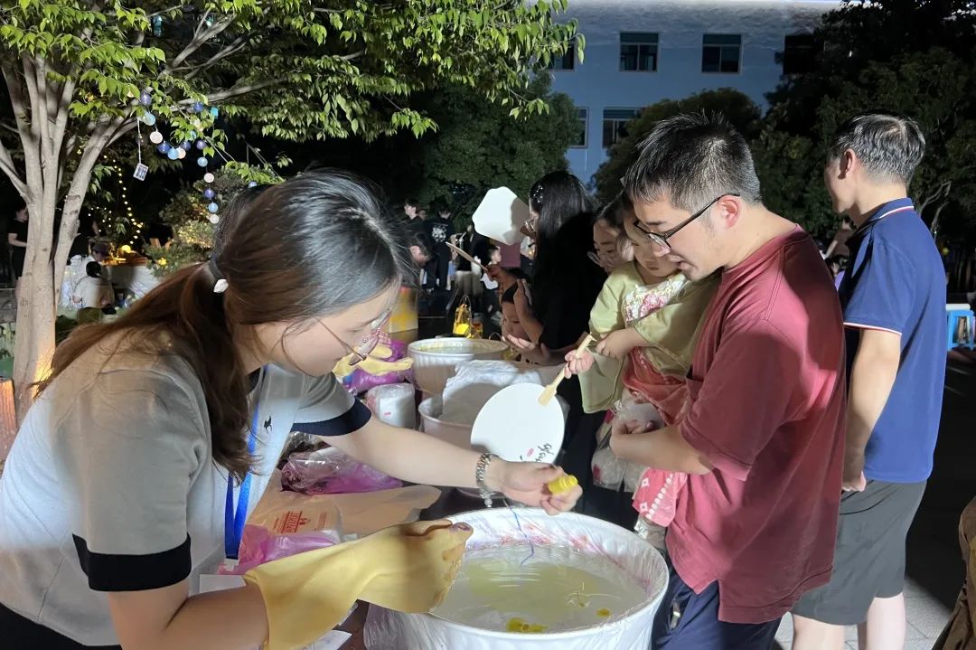 最忙的攤位,非漆扇制作莫屬了!大朋友小朋友們紛紛聚攏,去制作屬于自己的那一份獨(dú)一無(wú)二,滴、浸、旋、提,一把彩扇“呼之欲出”,一個(gè)個(gè)獨(dú)特的作品也隨即展現(xiàn),有的扇面似碧波蕩漾的水波紋,有的似梵高浪漫的星空…顯出隨機(jī)美感,真真是至“扇”至美!