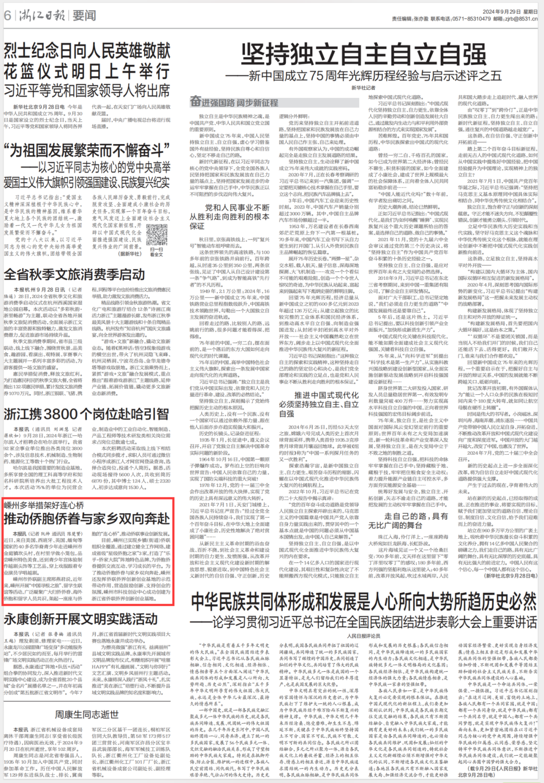 嵊州市僑聯(lián)副主席邢燕君說,近年來,嵊州開展“中國尋根之旅”、留學(xué)生聯(lián)誼等活動,廣泛凝聚廣大歸僑僑眷、海外僑胞和留學(xué)人員共識,架起一座座與僑胞的“連心橋”,推動僑聯(lián)事業(yè)創(chuàng)新發(fā)展。