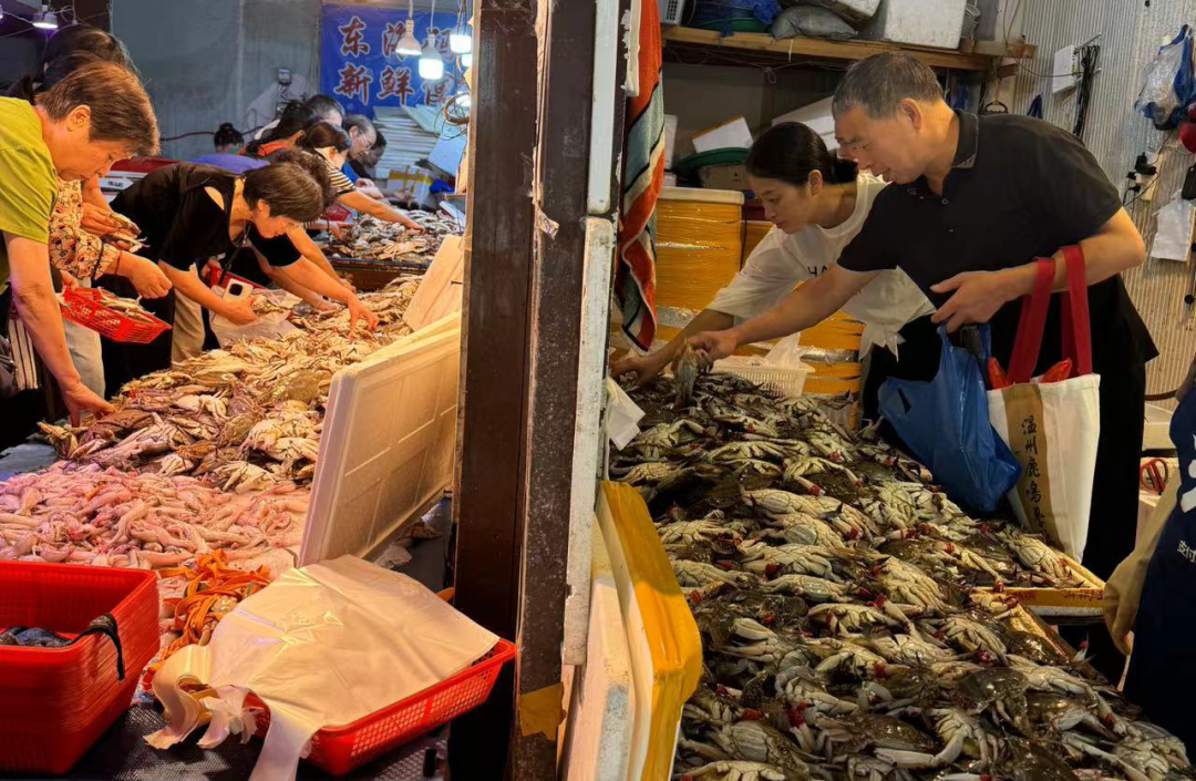 另一邊,大量冰鮮梭子蟹鋪放在一大塊木板上,15元一斤,實惠的價格也吸引了很多市民駐足挑選。