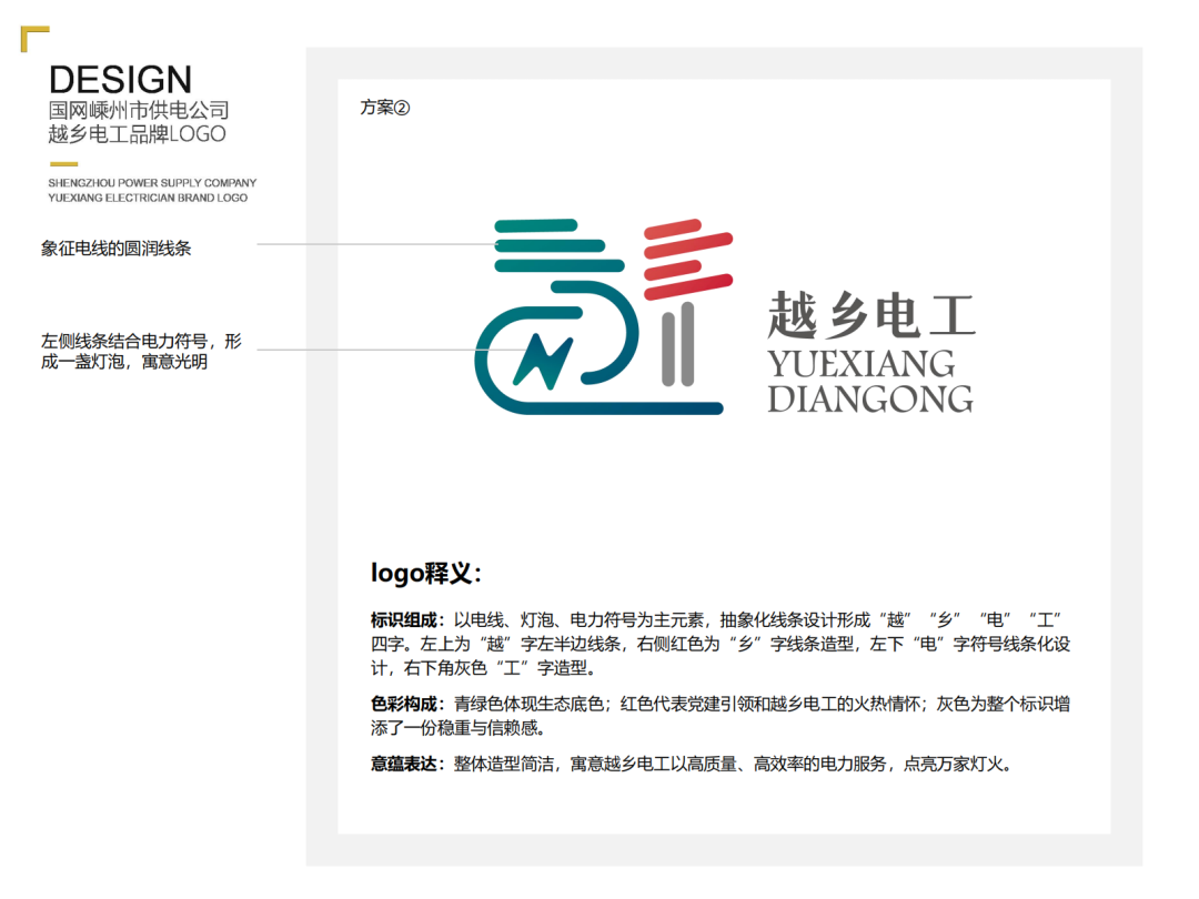 標(biāo)識(shí)組成:以電線、燈泡、電力符號(hào)為主元素,抽象化線條設(shè)計(jì)形成“越”“鄉(xiāng)”“電”“工”四字。左上為“越”字左半邊線條,右側(cè)紅色為“鄉(xiāng)”字線條造型,左下“電”字符號(hào)線條化設(shè)計(jì),右下角灰色“工”字造型。