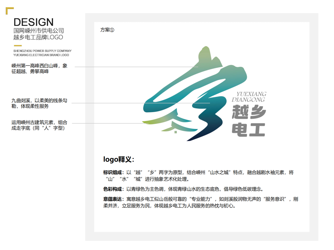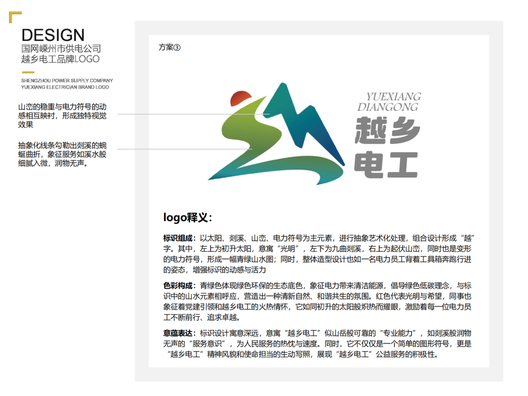 色彩構(gòu)成:青綠色體現(xiàn)生態(tài)底色;紅色代表黨建引領(lǐng)和越鄉(xiāng)電工的火熱情懷;灰色為整個(gè)標(biāo)識(shí)增添了一份穩(wěn)重與信賴感。