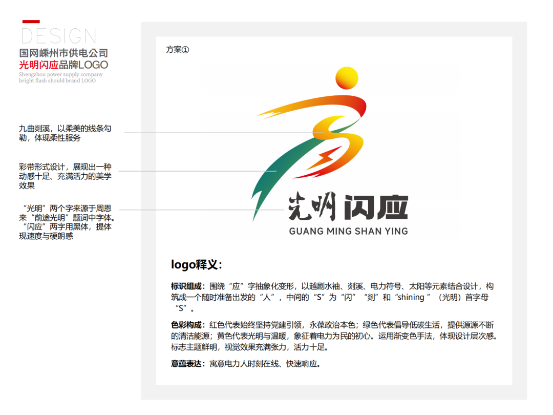 標(biāo)識(shí)組成:圍繞“應(yīng)”字抽象化變形,以越劇水袖、剡溪、電力符號(hào)、太陽(yáng)等元素結(jié)合設(shè)計(jì),構(gòu)筑成一個(gè)隨時(shí)準(zhǔn)備出發(fā)的“人”,中間的“S”為“閃”“剡”和“shining ”(光明)首字母“S”。