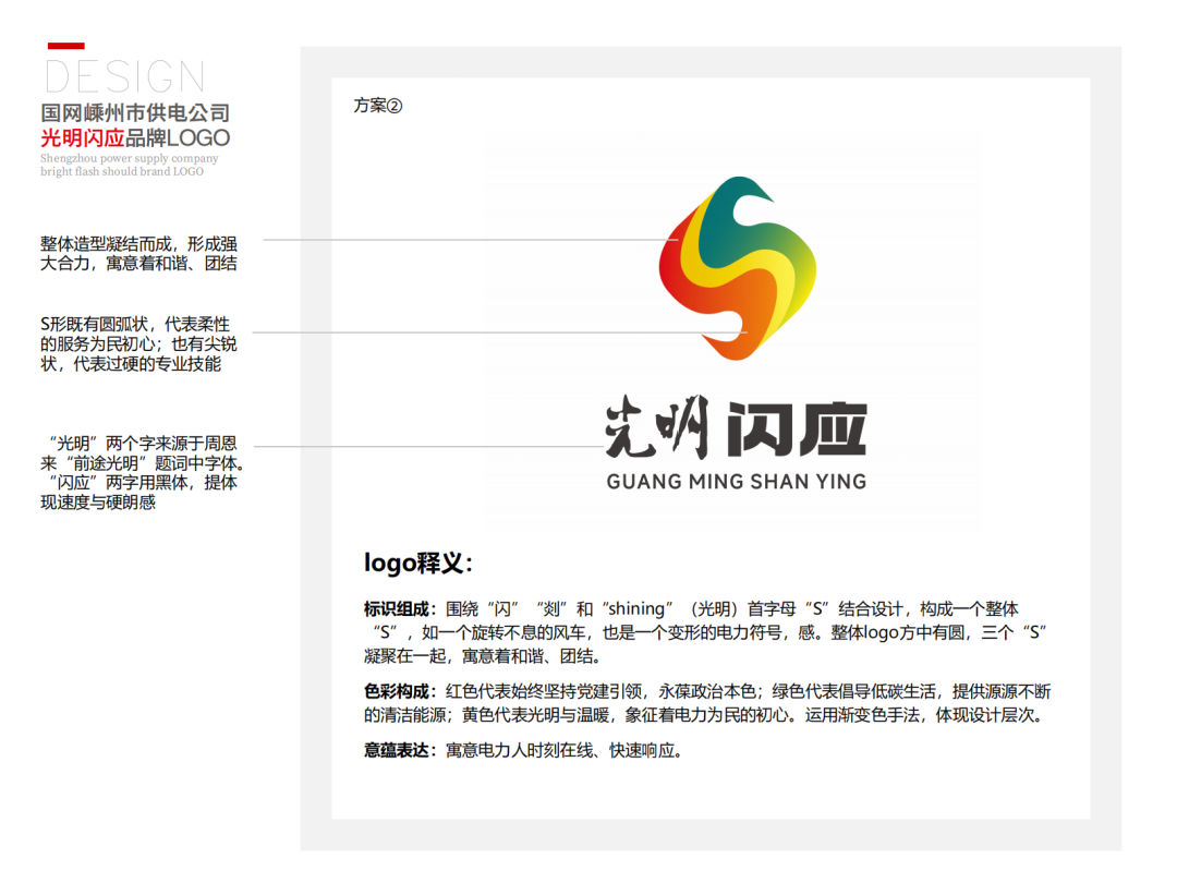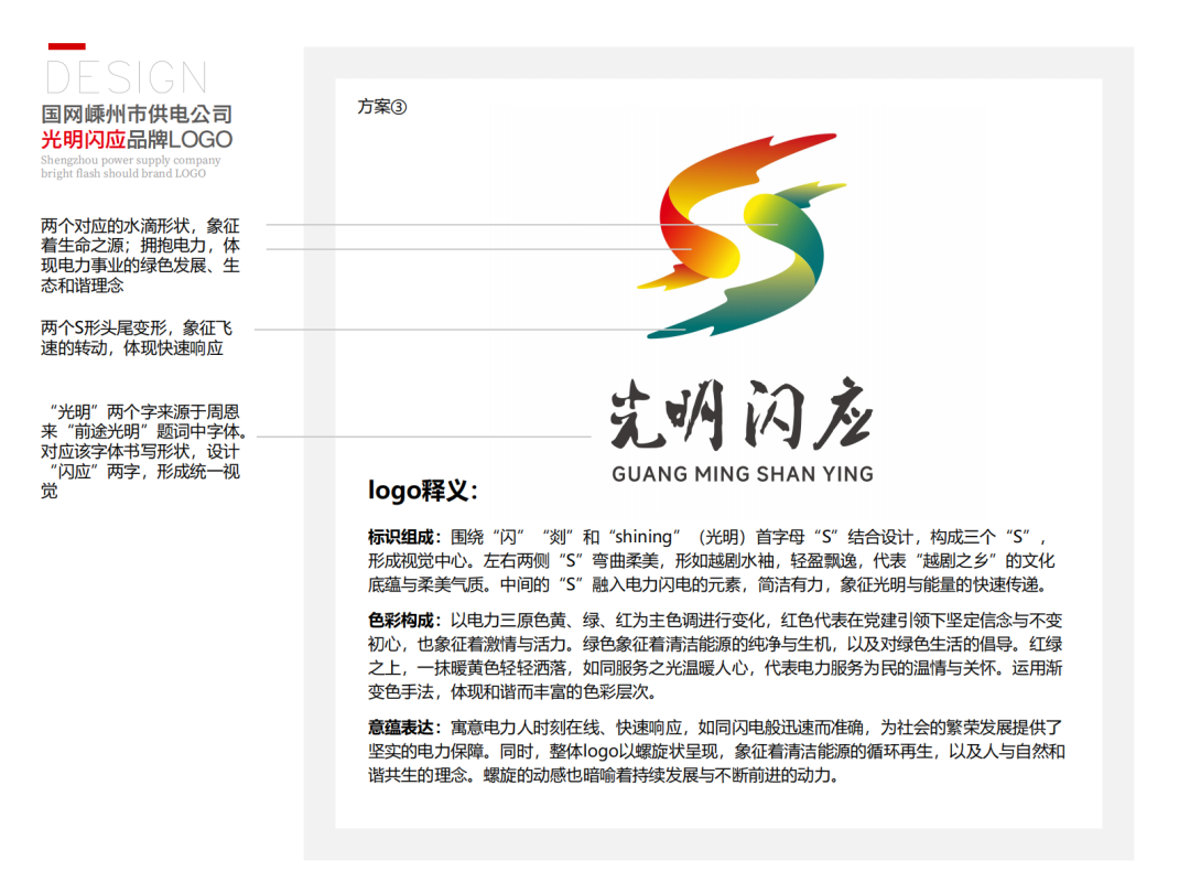 標(biāo)識(shí)組成:圍繞“閃”“剡”和“shining”(光明)首字母“S”結(jié)合設(shè)計(jì),構(gòu)成三個(gè)“S”,形成視覺(jué)中心。左右兩側(cè)“S”彎曲柔美,形如越劇水袖,輕盈飄逸,代表“越劇之鄉(xiāng)”的文化底蘊(yùn)與柔美氣質(zhì)。中間的“S”融入電力閃電的元素,簡(jiǎn)潔有力,象征光明與能量的快速傳遞。