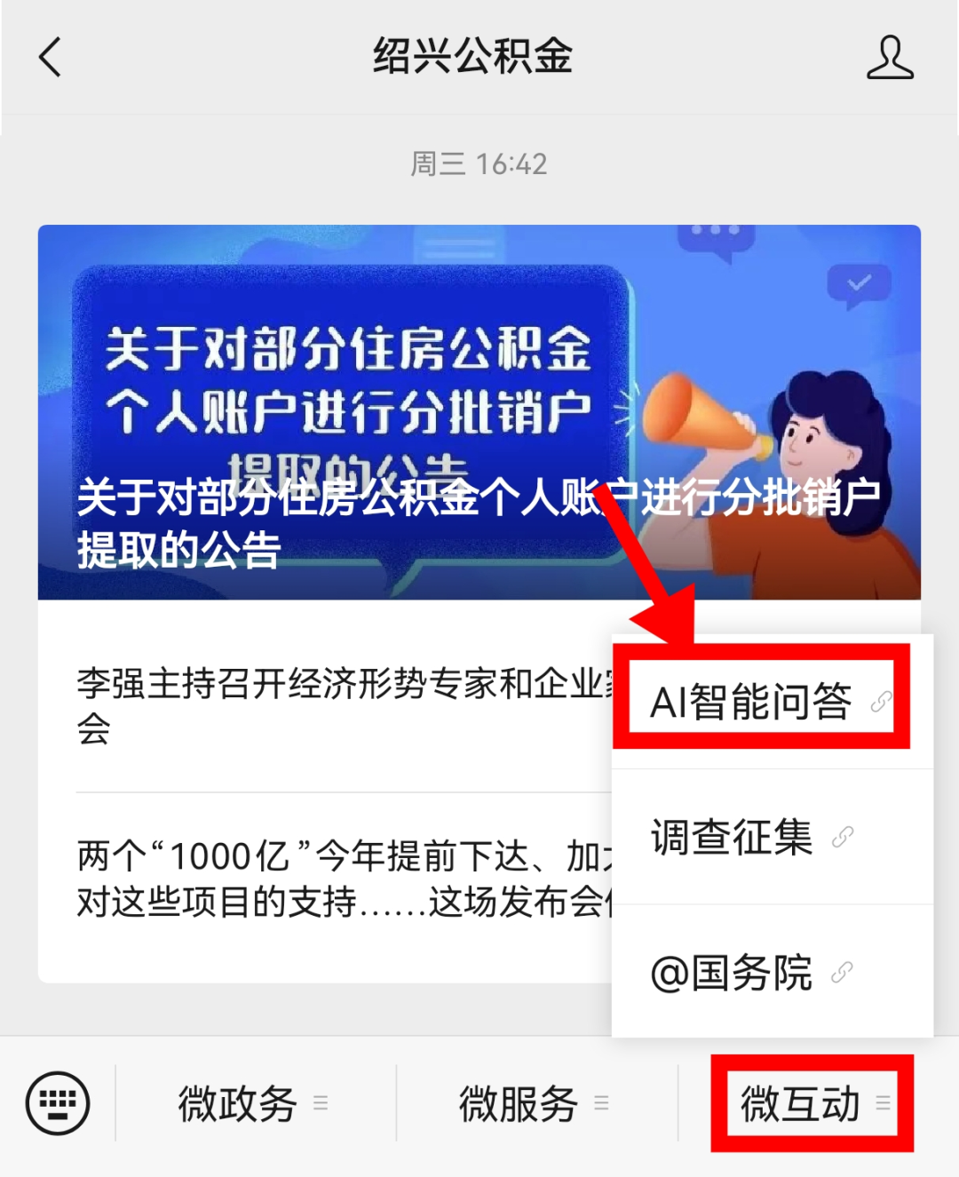 關(guān)注“紹興公積金”微信公眾號,點(diǎn)擊右下角“微互動(dòng)”-“AI智能問答”。