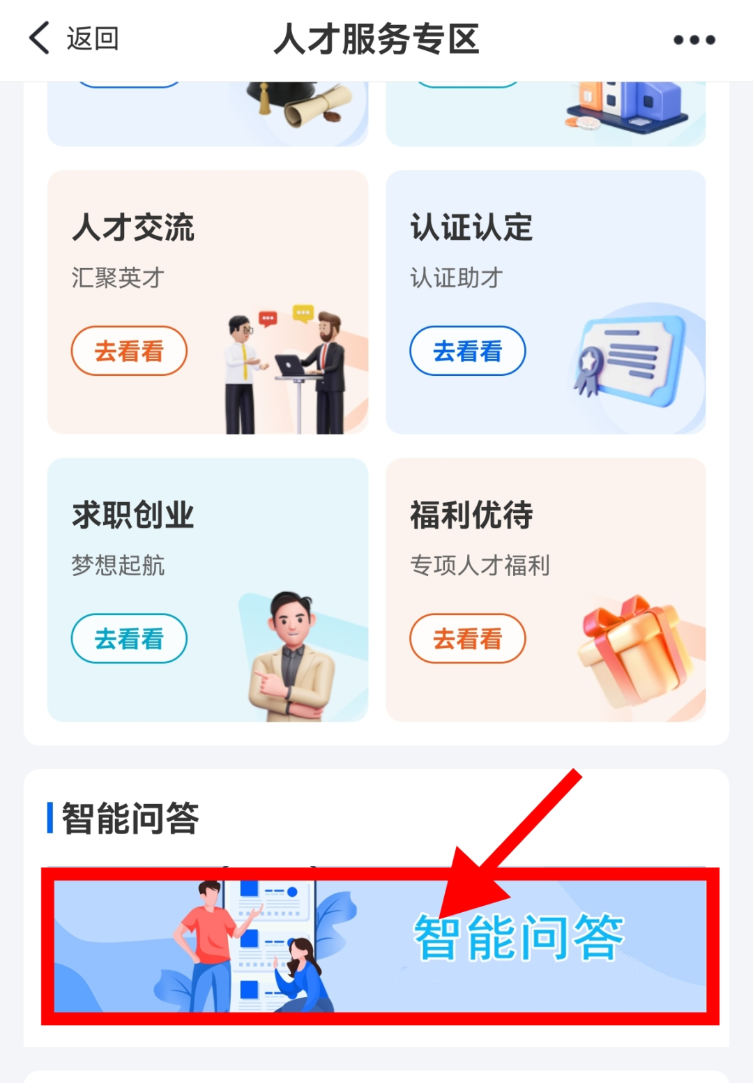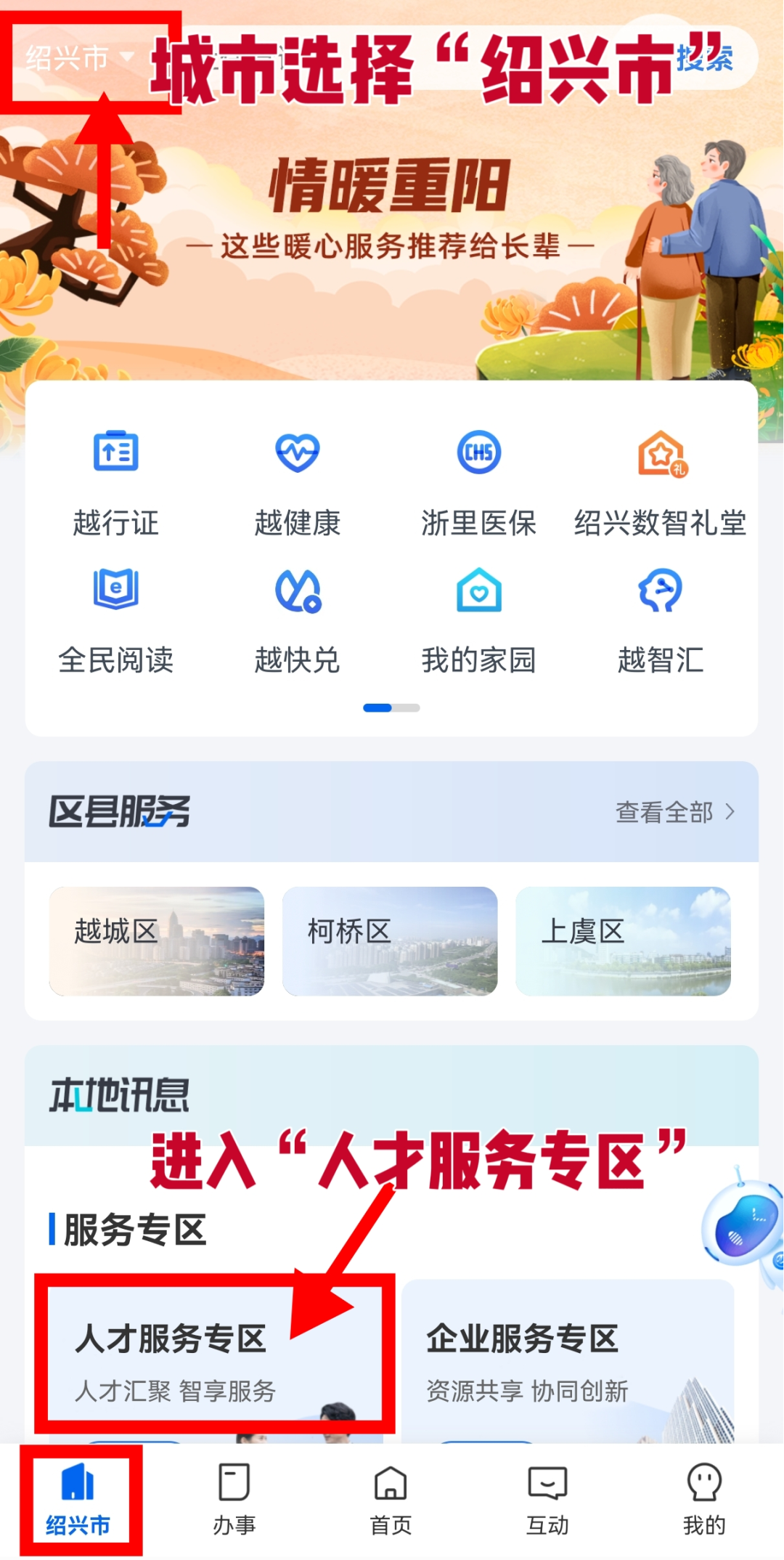 登錄“浙里辦”APP,點(diǎn)擊“城市”,地點(diǎn)改成“紹興市”,在“本地資訊”下面選擇“人才服務(wù)專區(qū)”,進(jìn)入人才服務(wù)專區(qū)后往下找,點(diǎn)擊“智能問答”。