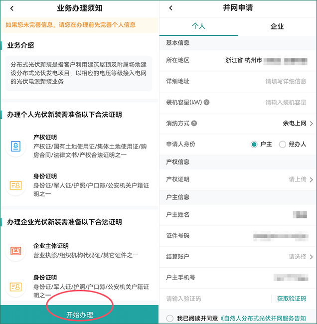 ②選擇所在地區(qū),點(diǎn)擊【開(kāi)始辦理】進(jìn)入并網(wǎng)申請(qǐng)頁(yè)面,填寫(xiě)相關(guān)資料后提交就可以啦。