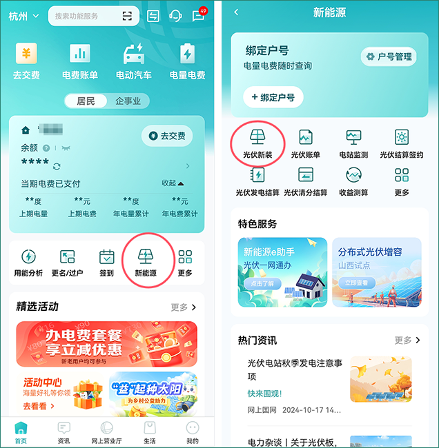 ①登錄并打開(kāi)網(wǎng)上國(guó)網(wǎng)App,首頁(yè)點(diǎn)擊【新能源】,進(jìn)入頁(yè)面后再點(diǎn)擊【光伏新裝】。