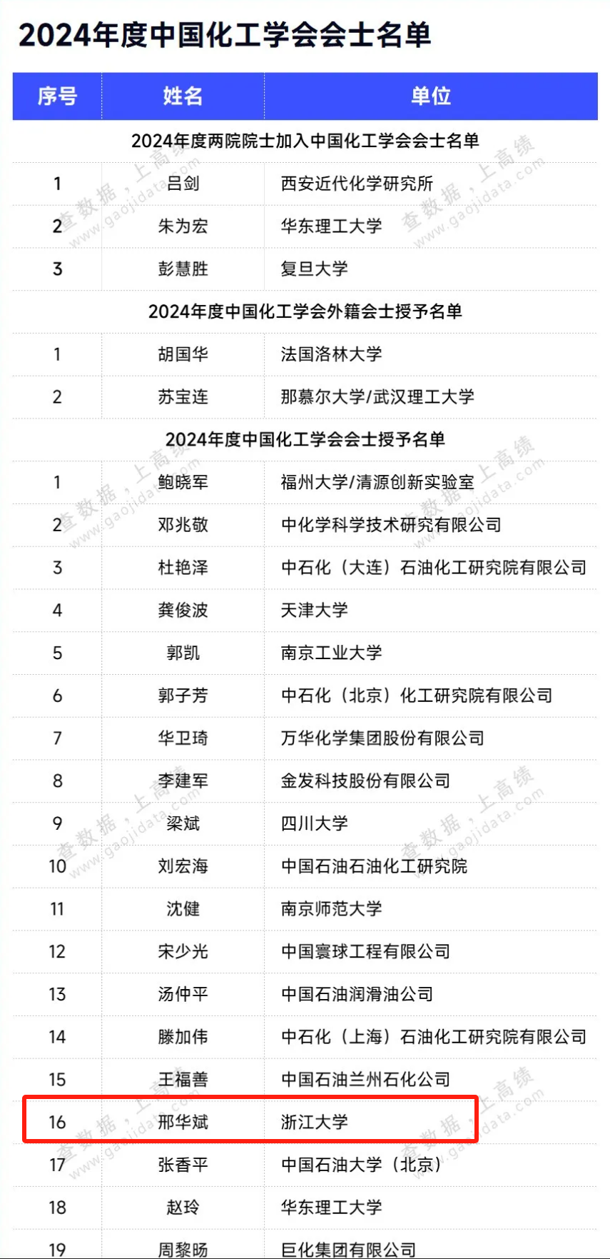 11月2日,中國化工學會2024年度會士授予儀式隆重舉行。浙江大學邢華斌當選中國化工學會會士。