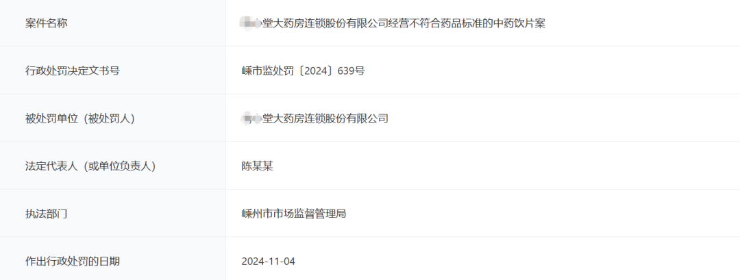 2024年8月7日,我局執(zhí)法人員對(duì)**堂大藥房連鎖股份有限公司馬橋藥房銷售的雞骨草(標(biāo)示生產(chǎn)單位:安徽仁之堂藥業(yè)股份有限公司;標(biāo)示批號(hào):230301;包裝規(guī)格:0.5kg/袋)抽樣并送紹興市食品藥品檢驗(yàn)研究院檢驗(yàn),檢驗(yàn)結(jié)果不符合規(guī)定,不合格項(xiàng)目為性狀及鑒別。行政處罰種類、依據(jù)、內(nèi)容:當(dāng)事人購(gòu)進(jìn)并銷售不合格藥品的行為,違反了《中華人民共和國(guó)藥品管理法》第九十八條之規(guī)定,應(yīng)當(dāng)按照《中華人民共和國(guó)藥品管理法》第一百一十七條之規(guī)定,給予行政處罰。鑒于當(dāng)事人履行了《中華人民共和國(guó)藥品管理法》規(guī)定的進(jìn)貨查驗(yàn)等義務(wù),有充分證據(jù)證明其不知道所經(jīng)營(yíng)的藥品為劣藥、假藥。根據(jù)《中華人民共和國(guó)藥品管理法實(shí)施條例》第七十五條”藥品經(jīng)營(yíng)企業(yè)、醫(yī)療機(jī)構(gòu)未違反《藥品管理法》和本條例的有關(guān)規(guī)定,并有充分證據(jù)證明其不知道所銷售或者使用的藥品是假藥、劣藥的,應(yīng)當(dāng)沒收其銷售或者使用的假藥、劣藥和違法所得;但是,可以免除其他行政處罰。"之規(guī)定,決定對(duì)當(dāng)事人處罰如下:1、沒收不合格雞骨草7.029kg。2、沒收違法所得340.07元。行政處罰履行方式和期限:當(dāng)事人自收到行政處罰決定書之日起十五日內(nèi),按照行政處罰決定書載明的履行方式履行。