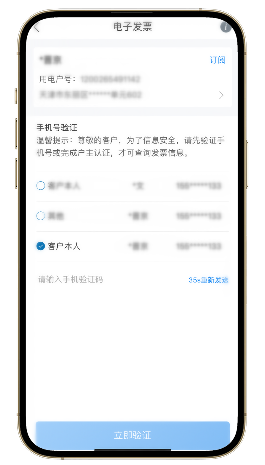 為了信息安全,低壓居民用戶查詢、開具電子發(fā)票,需要先驗證手機號(戶主手機號)或者完成戶主認證