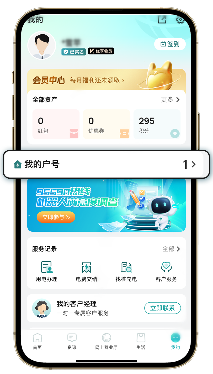 點擊網(wǎng)上國網(wǎng)App底部導(dǎo)航欄“我的”-“我的戶號”進入戶號管理頁面。