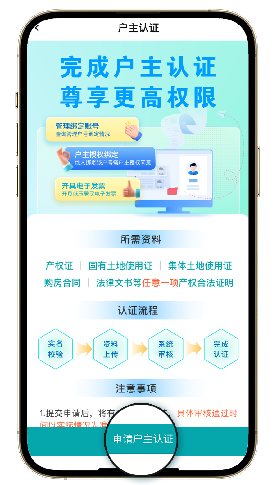 選擇需要進行戶主認證的戶號,點擊“申請戶主認證”。