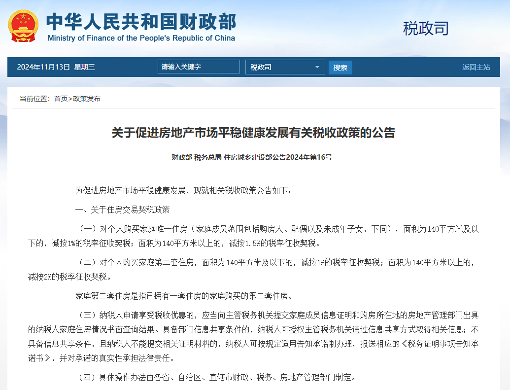 11月13日,財政部、稅務(wù)總局、住房和城鄉(xiāng)建設(shè)部發(fā)布《關(guān)于促進房地產(chǎn)市場平穩(wěn)健康發(fā)展有關(guān)稅收政策的公告》,明確多項支持房地產(chǎn)市場發(fā)展的稅收優(yōu)惠政策。個人購買家庭唯一住房和家庭第二套住房