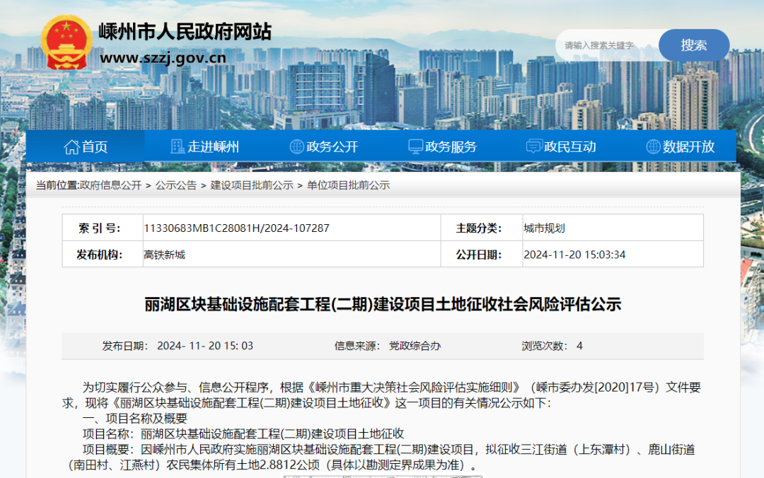 昨日,嵊州人民政府網(wǎng)站發(fā)布了麗湖區(qū)塊基礎(chǔ)設(shè)施配套工程(二期)建設(shè)項目土地征收社會風(fēng)險評估公示。