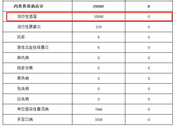 同期,丙類傳染病共報告25502例,未報告死亡。報告發(fā)病數(shù)居前3位的病種依次為流行性感冒、其他感染性腹瀉病和手足口病,占丙類傳染病報告病例總數(shù)的99.11%。