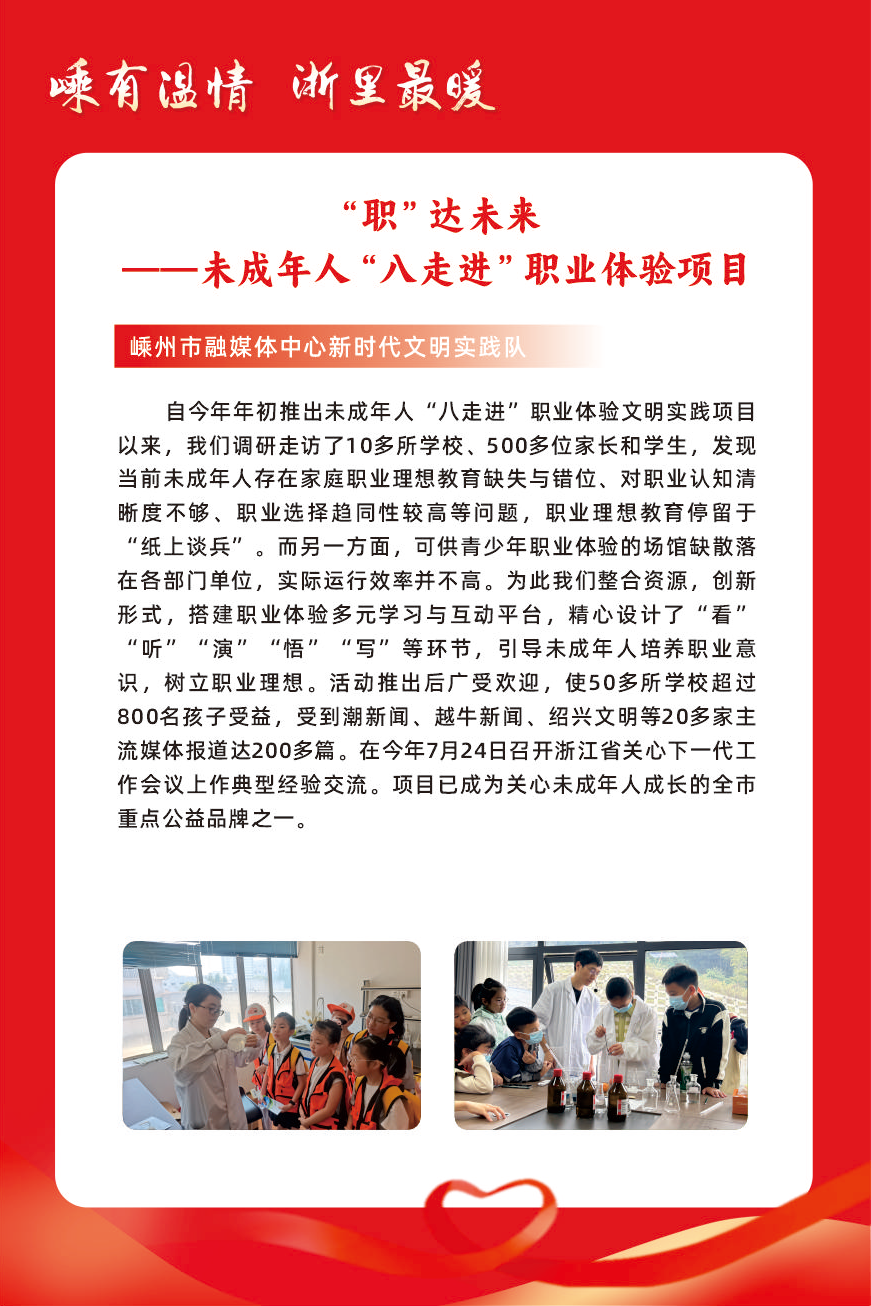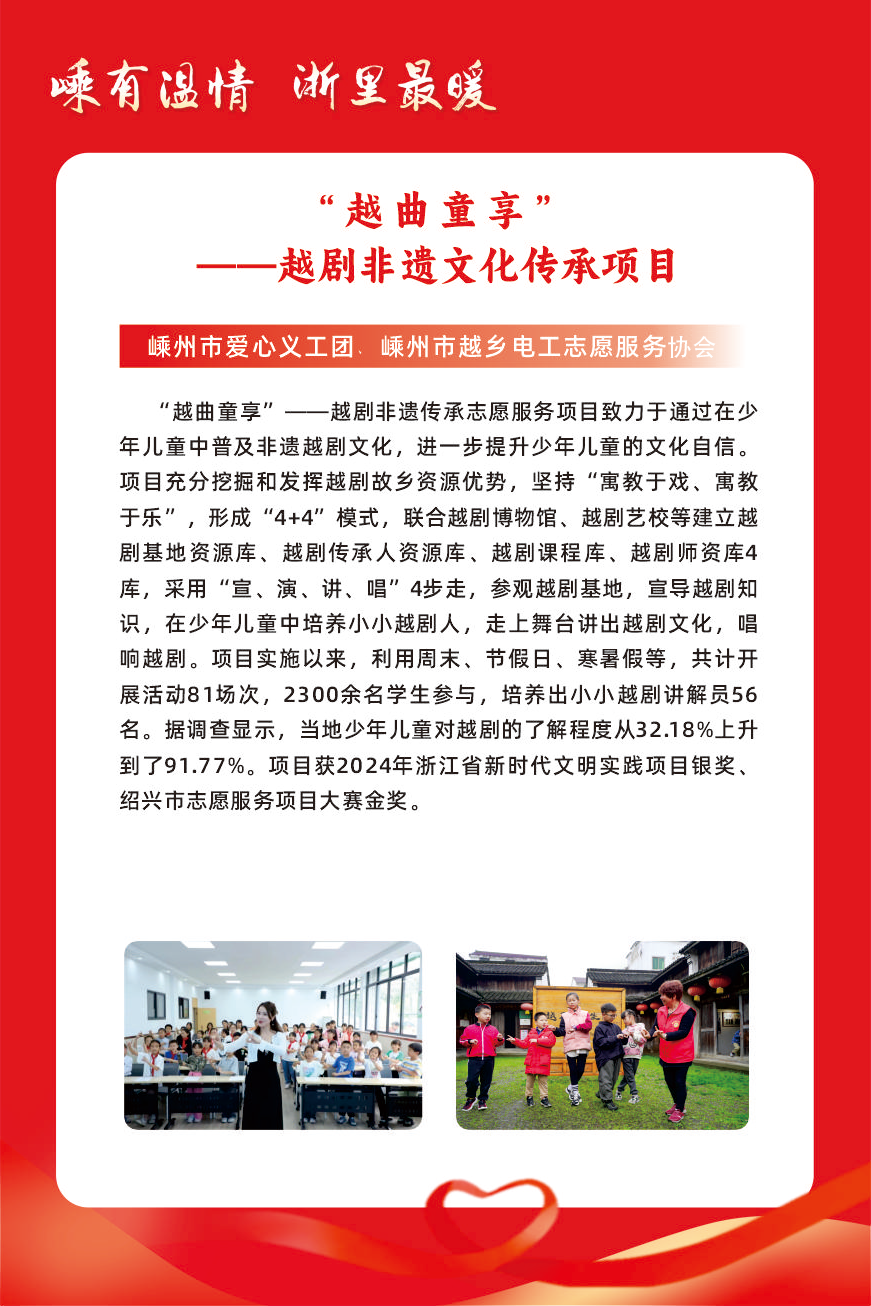 為深入貫徹落實習(xí)近平總書記關(guān)于志愿服務(wù)和精神文明的重要指示批示精神,全面打響“嵊有溫情,浙里最暖”特色志愿服務(wù)品牌,聚力打造志愿服務(wù)新高地,2024年,嵊州市委社會工作部、嵊州市文明辦、共青團嵊州市委、嵊州市志愿者協(xié)會聯(lián)合舉辦嵊州市第五屆志愿服務(wù)和文明實踐項目大賽。