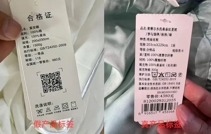 此外,據(jù)某品牌蠶絲被店員表示,如果仔細(xì)對比,其包裝、標(biāo)簽和LOGO都和正品有所區(qū)別。