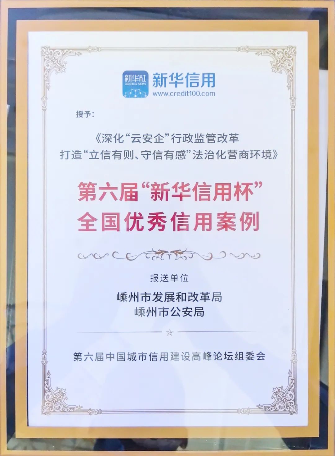 12月20日,由新華通訊社指導(dǎo),新華社中國經(jīng)濟(jì)信息社、新華社內(nèi)蒙古分社主辦,呼和浩特市人民政府承辦的第六屆中國城市信用建設(shè)高峰論壇順利召開。論壇上正式公布了第六屆“新華信用杯”全國優(yōu)秀信用案例暨優(yōu)秀信用應(yīng)用場景微視頻評(píng)選結(jié)果,嵊州市發(fā)展和改革局、嵊州市公安局報(bào)送的《深化“云安企”行政監(jiān)管改革 打造“立信有則、守信有感”法治化營商環(huán)境》榮獲第六屆“新華信用杯”全國優(yōu)秀信用案例。