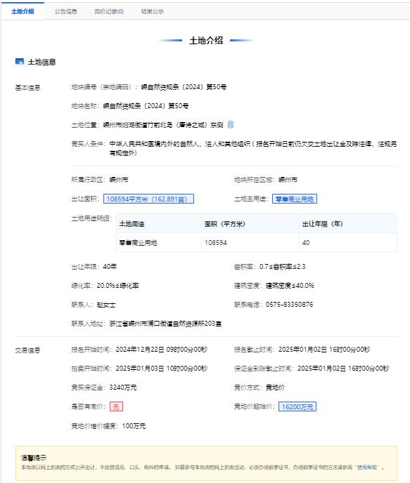 經(jīng)嵊州市人民政府批準(zhǔn),嵊州市自然資源和規(guī)劃局決定于2025年1月3日上午10時(shí)00分,以網(wǎng)上拍賣(mài)方式公開(kāi)出讓1宗國(guó)有建設(shè)用地使用權(quán)。