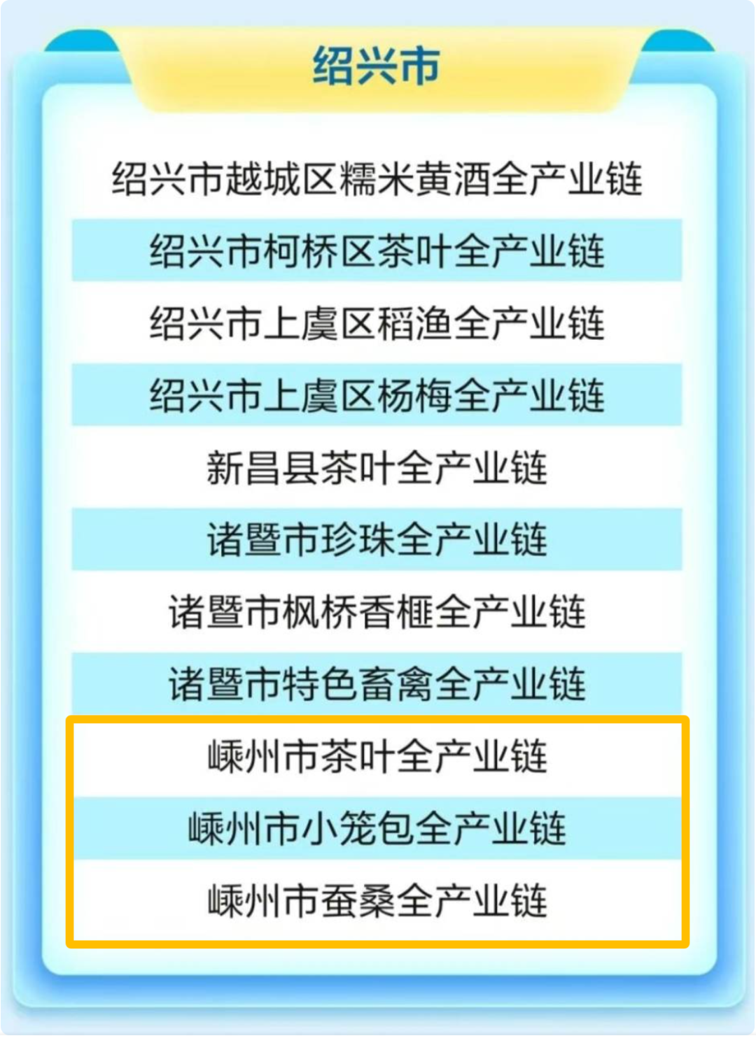 近日,省農(nóng)業(yè)農(nóng)村廳公布了2024年縣域10億元以上“土特產(chǎn)”全產(chǎn)業(yè)鏈名單,全省共126條入選,嵊州共3條入選,分別為嵊州市茶葉全產(chǎn)業(yè)鏈、嵊州市小籠包全產(chǎn)業(yè)鏈、嵊州市蠶桑全產(chǎn)業(yè)鏈。