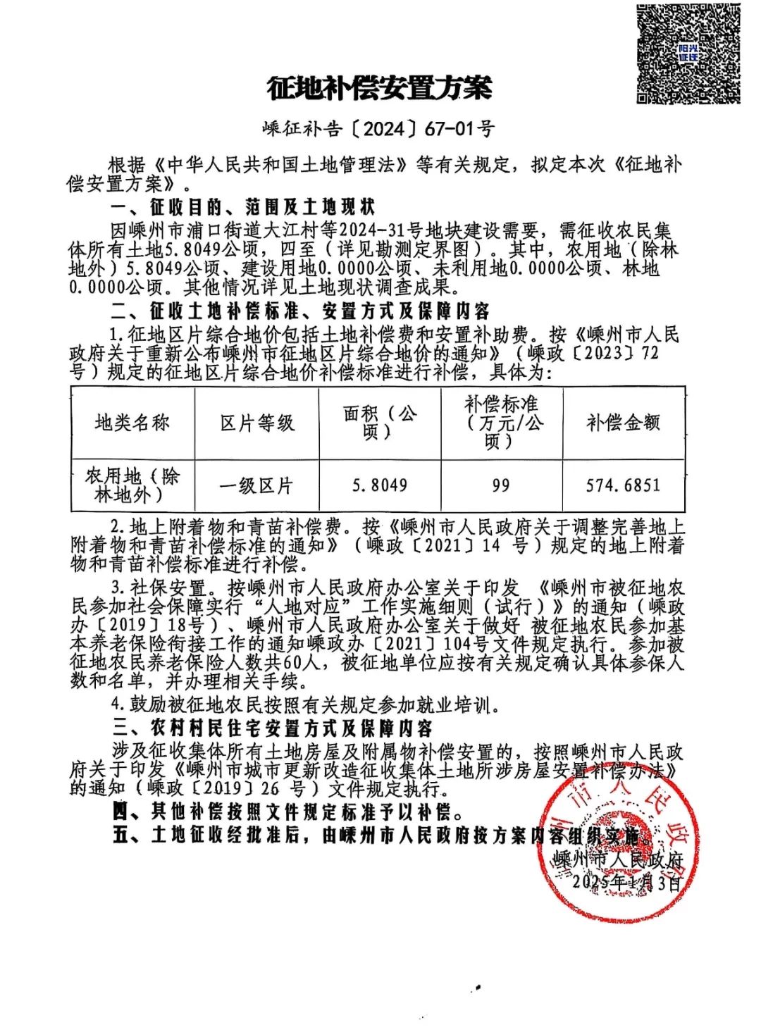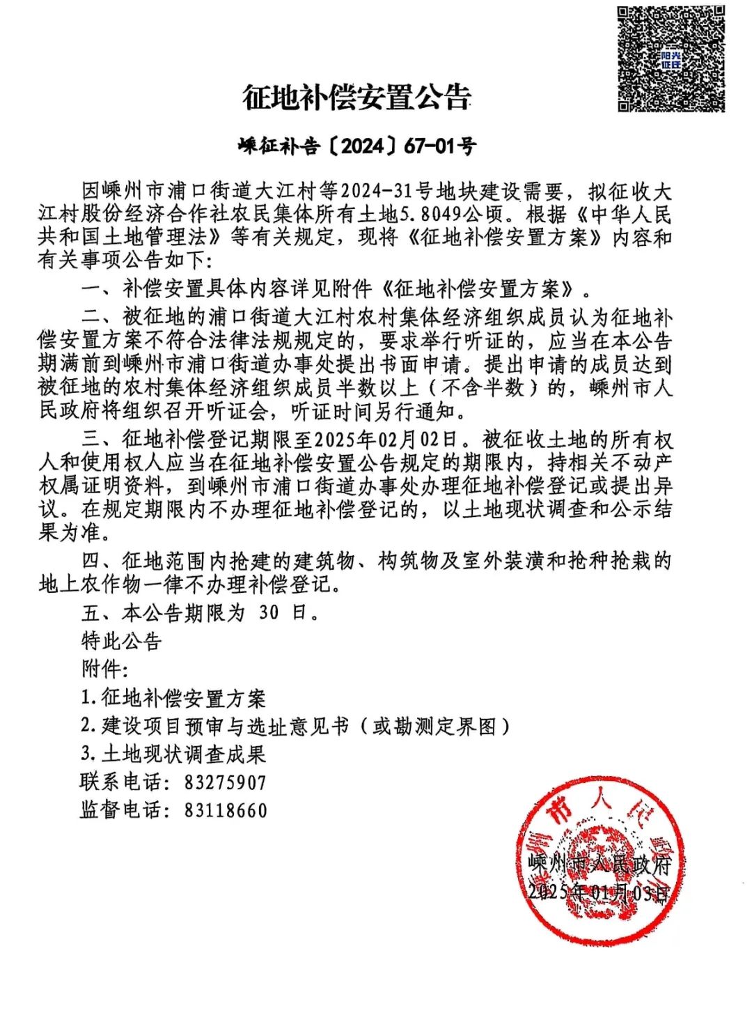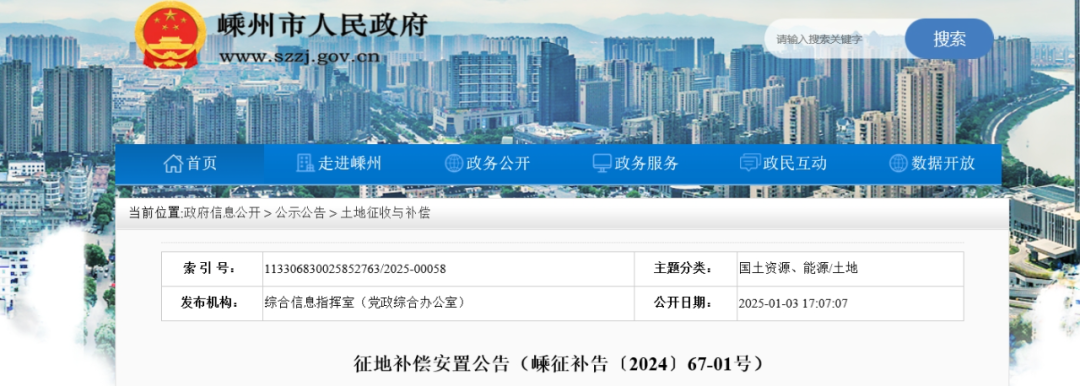 現(xiàn)將征地補(bǔ)償安置公告(嵊征補(bǔ)告〔2024〕67-01號(hào))公示如下,詳見下圖: