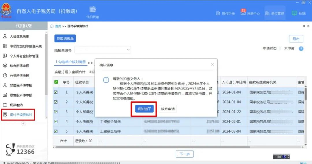 自2025年1月1日至3月31日,扣繳單位財(cái)務(wù)人員可通過自然人電子稅務(wù)局(扣繳端)“退付手續(xù)費(fèi)核對(duì)”模塊申請(qǐng)辦理2024年度個(gè)人所得稅扣繳手續(xù)費(fèi)退付。