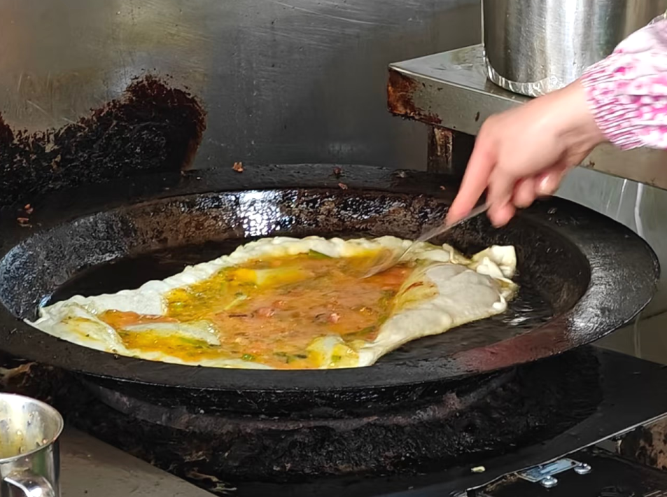小小的面餅,被搟面杖輕輕推開,扒拉成鍋?zhàn)哟笮?。熱鍋上,油花微微跳?dòng),面餅攤在鍋里漸漸收縮,邊緣泛起金黃的焦香。老板抄起一只小小的不銹鋼杯子詢問著要添加的餡料。