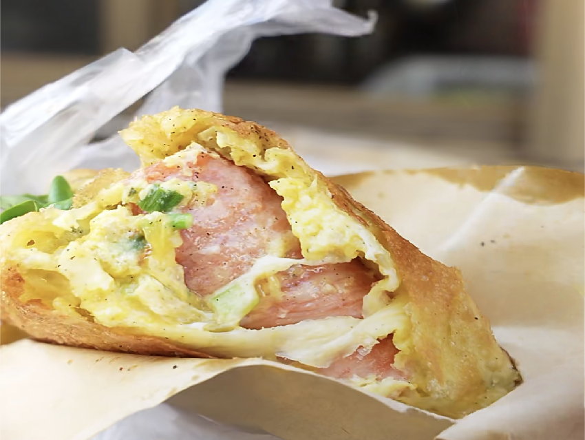雞蛋液緩緩倒在面餅上,熱氣升騰間,蛋香與蔥蒜香的活潑,侵占了每一口呼吸之中,沉穩(wěn)的面香于熱氣中彌漫著溫暖氣息。餅面對(duì)折,漸漸鼓起,金黃的外皮上點(diǎn)綴著細(xì)小的氣泡。老板利索地將其切割折疊,靜置在過濾網(wǎng)上。切面處,肉眼可見金黃雞蛋、翠色蔥花、橘紅里脊肉,豐富的層次訴說著它的酥脆與柔軟。如果覺得油膩了些,還可以加點(diǎn)生菜來解膩。