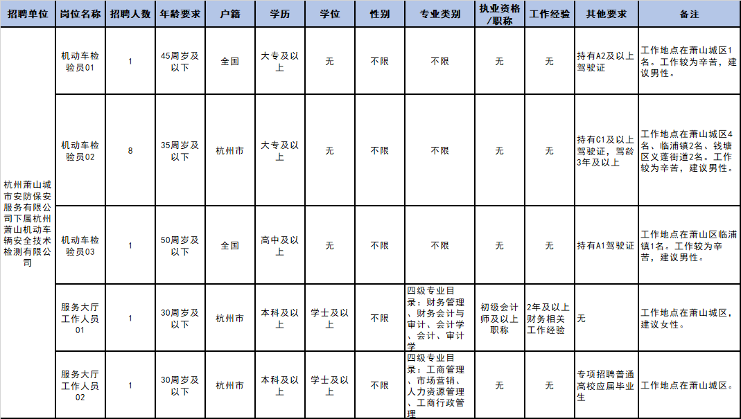 公司成立于2014年10月,系蕭山環(huán)投集團(tuán)旗下杭州蕭山城市安防保安服務(wù)有限公司全資子公司。本次計(jì)劃招聘12人,其中“機(jī)動車檢驗(yàn)員03”崗位50周歲及以下可報(bào)名。