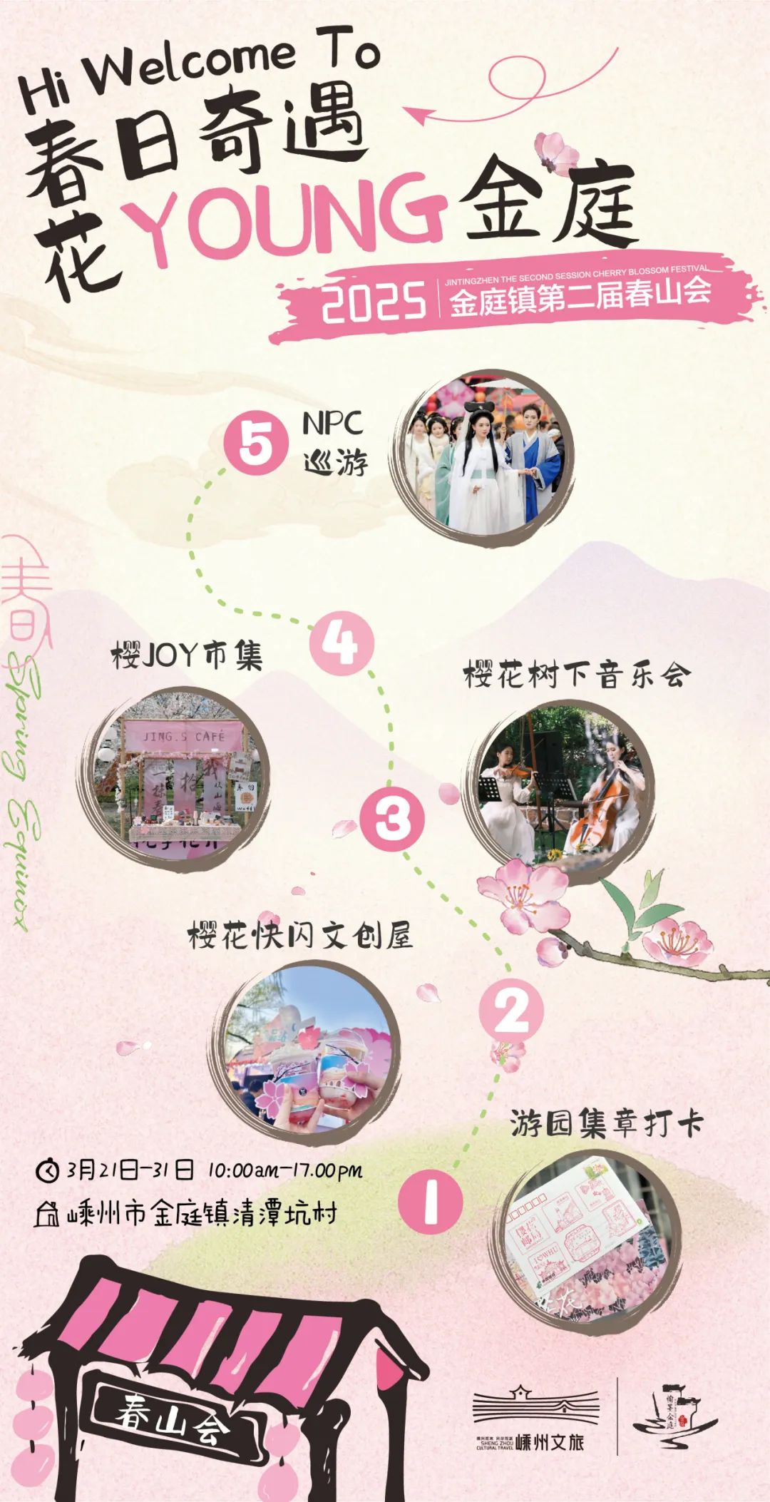 2025年3月21日至3月31日 春日奇遇·花YOUNG金庭 2025金庭鎮(zhèn)第二屆春山會(huì) 等你來(lái) 春山會(huì)賞櫻攻略來(lái)啦~ 上春山賞櫻,一定要去櫻花快閃文創(chuàng)屋逛逛,文旅聯(lián)名款桃形李西打果酒,滿是嵊州元素的文創(chuàng)保溫杯、冰箱貼、杜邦紙袋、越劇郵票冊(cè)、嵊州風(fēng)景明信片、粘粘土、鼠標(biāo)墊…… 先看看這些文創(chuàng)吧~ 桃形李,嵊州市金庭鎮(zhèn)的瑰寶特產(chǎn),其果形似桃,口感爽甜脆嫩,融合桃之清甜與李之香氣。文旅集團(tuán)深掘本土資源,攜手本地優(yōu)質(zhì)果酒企業(yè),以國(guó)家級(jí)地理標(biāo)志農(nóng)產(chǎn)品“桃形李”為核心,匠心打造聯(lián)名款文旅產(chǎn)品——桃形李西打果酒。 (注:本產(chǎn)品使用桃形李果肉打漿參與發(fā)酵而成,酒體中富含天然果肉和纖維素,如有懸浮沉淀、液位小范圍波動(dòng)為正?,F(xiàn)象。) 嵊州文創(chuàng)每一樣都在“心趴上” 心動(dòng)不如行動(dòng) 那就趕緊出發(fā) 把這些文創(chuàng)帶回家~ 嵊州文創(chuàng)每一樣都在“心趴上” 心動(dòng)不如行動(dòng) 那就趕緊出發(fā) 把這些文創(chuàng)帶回家~ 在賞櫻集市“春日雅集”拾趣時(shí)光,超多好物等你帶走~ 為了大家有更好地賞櫻體驗(yàn),春日奇遇·花YOUNG金庭——2025金庭鎮(zhèn)第二屆春山會(huì)主辦方特推出嵊州賞櫻寵“粉”大禮包,陪伴大家在嵊州來(lái)一場(chǎng)春日奇遇!