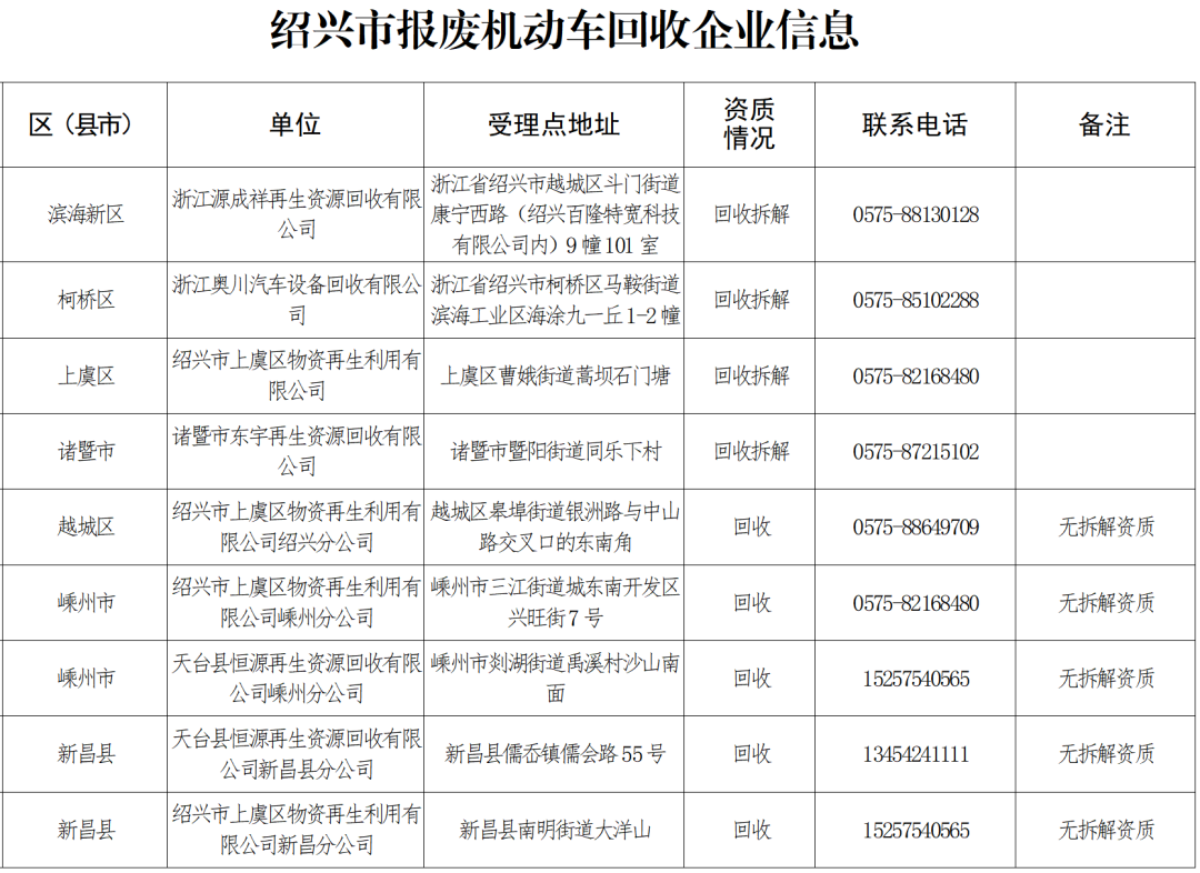 3.紹興市報(bào)廢機(jī)動(dòng)車(chē)回收企業(yè)名單