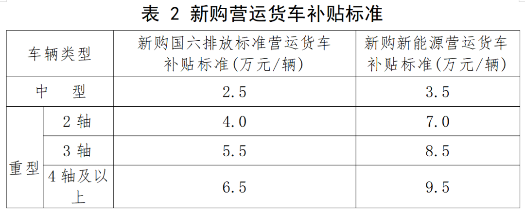 其中,新購(gòu)國(guó)六排放標(biāo)準(zhǔn)營(yíng)運(yùn)貨車(chē)或新能源營(yíng)運(yùn)貨車(chē)補(bǔ)貼標(biāo)準(zhǔn)見(jiàn)表2。報(bào)廢老舊營(yíng)運(yùn)貨車(chē)提前報(bào)廢時(shí)間不足1年的,可以申請(qǐng)新購(gòu)營(yíng)運(yùn)貨車(chē)補(bǔ)貼。