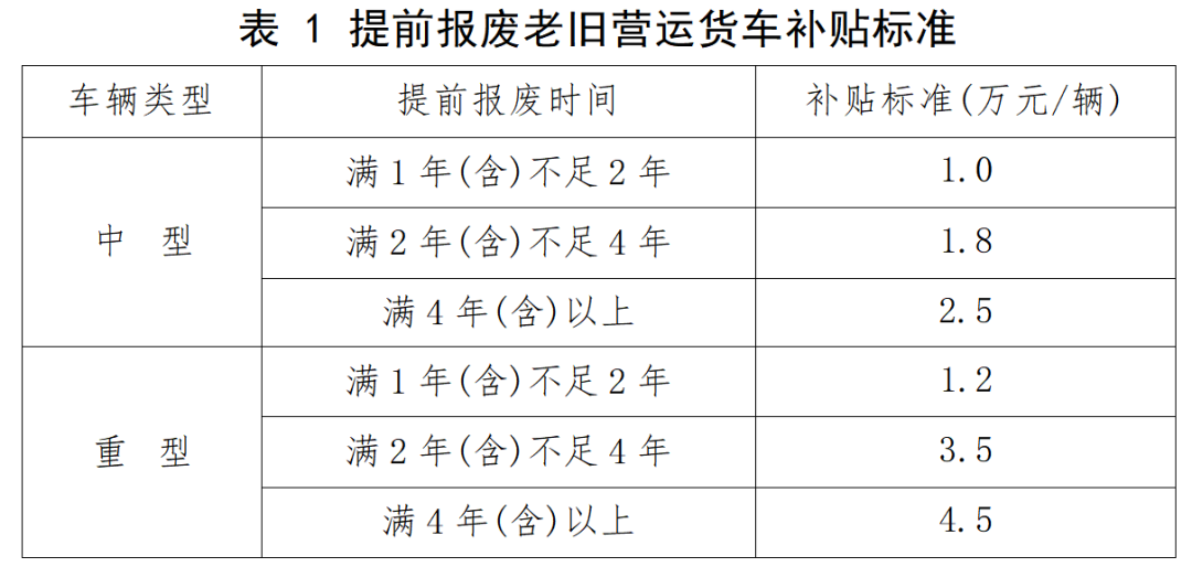 一、提前報(bào)廢老舊營(yíng)運(yùn)貨車(chē)補(bǔ)貼標(biāo)準(zhǔn)見(jiàn)表1。