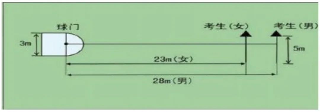 考試方法:如圖 1 所示,傳球目標(biāo)區(qū)域由一個(gè)室內(nèi)五人制足球門(mén)(球門(mén)凈寬度 3 米,凈高度 2 米)和以球門(mén)線為直徑(3 米)畫(huà)的半圓組成,圓心(球門(mén)線中心點(diǎn))至起點(diǎn)線垂直距離為 23 米(男28米)??忌殞⑶蛑糜谄瘘c(diǎn)線上(線長(zhǎng) 5 米,寬 0.1 米),向目標(biāo)區(qū)域連續(xù)傳球6 次,左右腳均可,腳法不限。