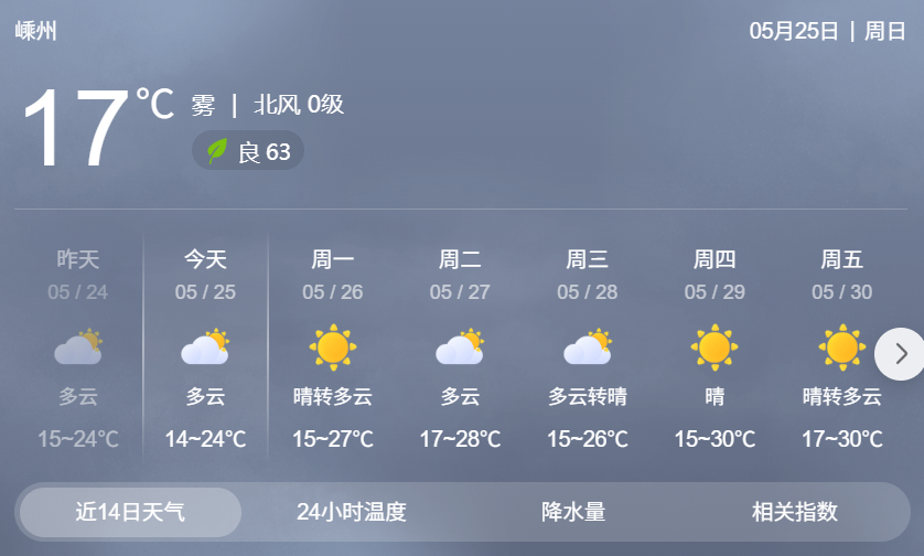 展望未來(lái)一周,天氣在陰到多云與多云之間切換,到了5月26-27日,天空放晴,陽(yáng)光毫無(wú)保留地傾灑而下。此時(shí),最高氣溫攀升至27~28℃,熱意逐漸在空氣中彌漫開(kāi)來(lái)。不過(guò),這熱度并不灼人,偶爾吹來(lái)的微風(fēng),帶著絲絲涼意,讓人感到無(wú)比愜意。