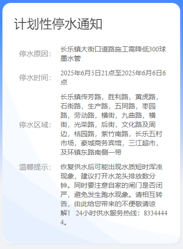 停水原因:長樂鎮(zhèn)大街口道路施工需降低300球墨水管