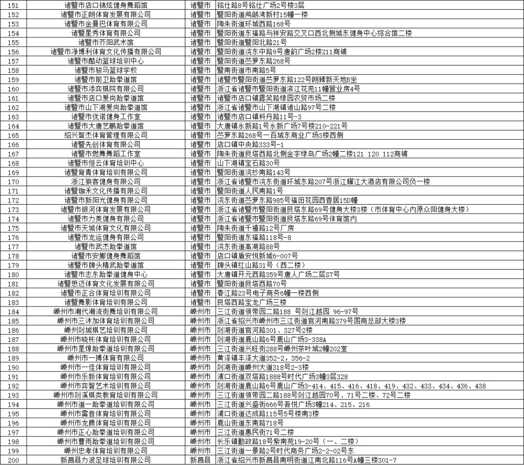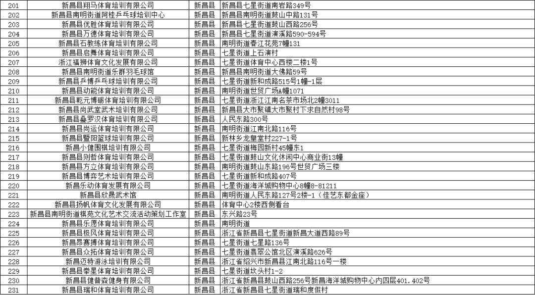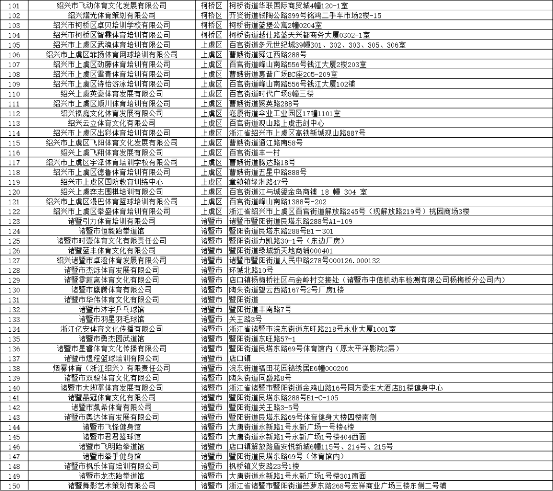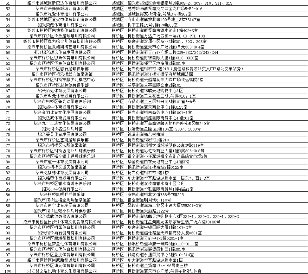 為深入貫徹落實(shí)國家“雙減”政策,維護(hù)廣大家長和學(xué)生的體育培訓(xùn)合法權(quán)益,經(jīng)市縣兩級(jí)體育行政部門審核,現(xiàn)公布紹興市已入駐全國校外教育培訓(xùn)監(jiān)管與服務(wù)綜合平臺(tái)并開通資金監(jiān)管賬戶合規(guī)經(jīng)營的體育類培訓(xùn)機(jī)構(gòu)名單,總數(shù)231家,詳情如下(排名不分先后):
