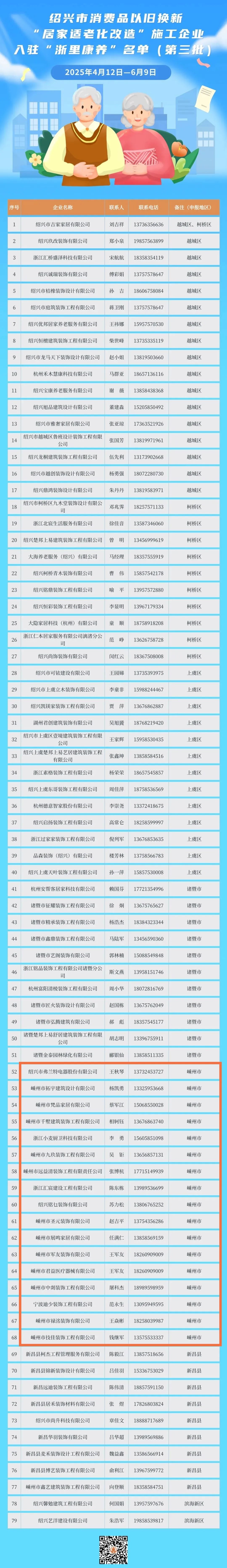 根據(jù)《關(guān)于啟動(dòng)2025年紹興市消費(fèi)品以舊換新“居家適老化改造”施工企業(yè)備案的公告》,截至6月9日,紹興市已有327家施工企業(yè)入駐“浙里康養(yǎng)”系統(tǒng)。今年入駐的施工企業(yè)可在紹興市范圍內(nèi)開(kāi)展居家適老化改造工作。