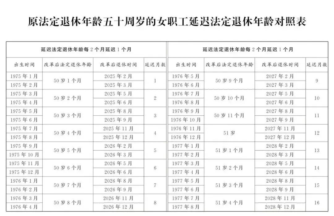 從2025年1月1日起,原法定退休年齡為五十周歲的女職工,法定退休年齡每二個(gè)月延遲一個(gè)月,逐步延遲至五十五周歲。