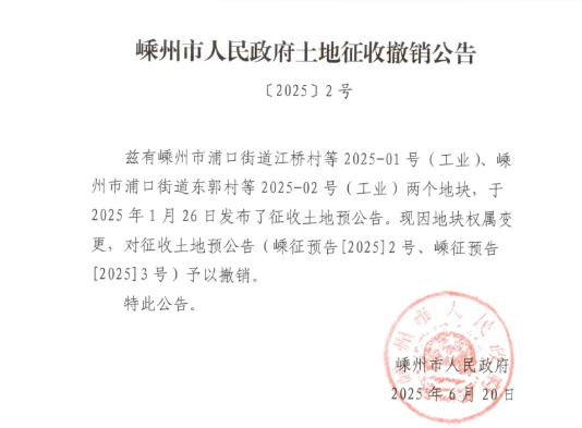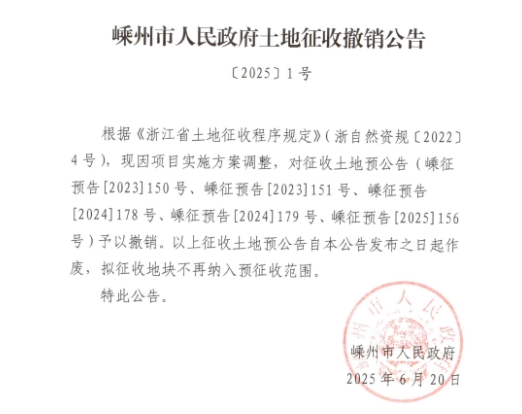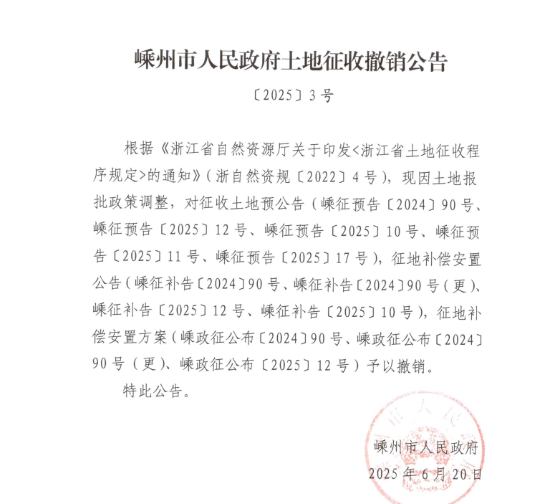 公告已出!因項(xiàng)目實(shí)施方案調(diào)整,嵊州多宗土地撤銷征收